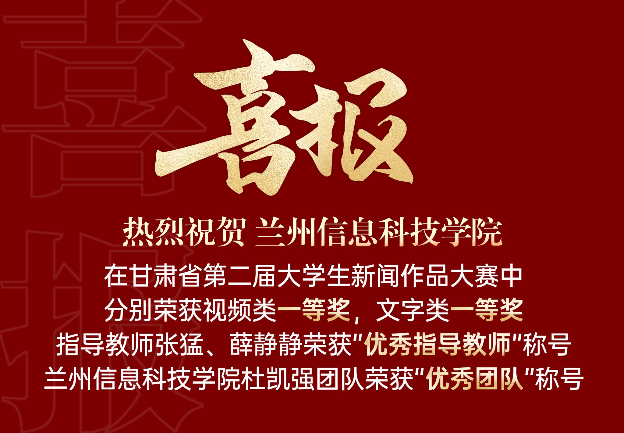 近日,由甘肃省教育厅主办的第二届甘肃省大学生新闻作品大赛决赛结果揭晓。BEAT365英国官网参赛的2件新闻作品,从全省20所本科院校的114件参赛作品中脱颖而出,分别荣获视频类第一和文字类第一,指导教师张猛、薛静静荣获“优秀指导教师”称号,BEAT365英国官网杜凯强团队荣获“优秀团队”称号。
