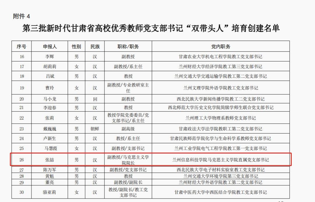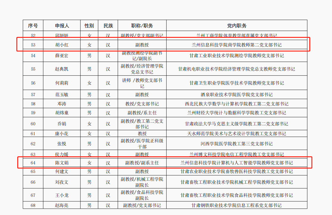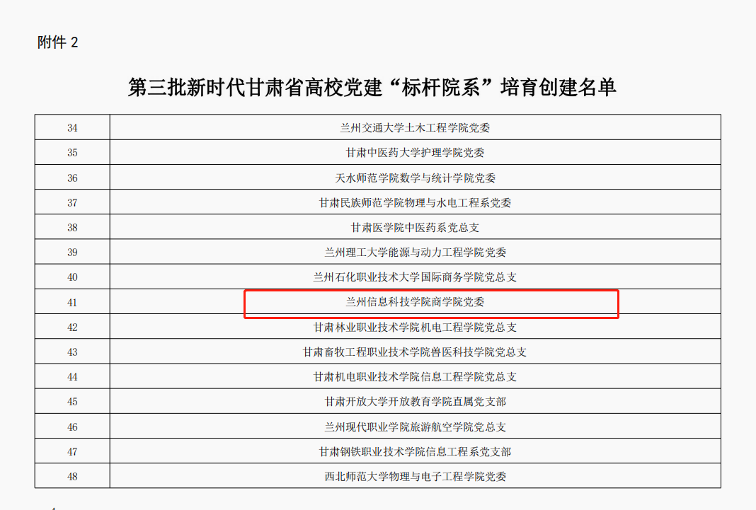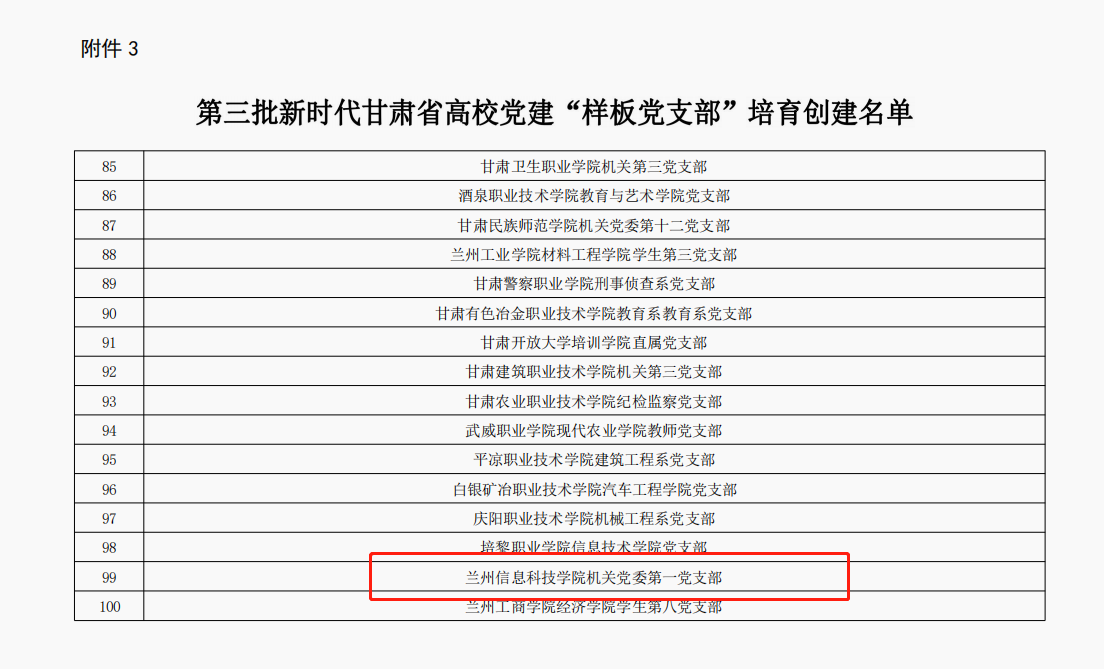 近日,省委教育工委公布第三批新时代甘肃省大中小学党建“对标争先”培育创建单位名单,BEAT365英国官网作为唯一一所民办院校入选“示范院校”创建单位。同时,学校商学院党委入选党建“标杆院系”,机关党委第一党支部入选党建“样板党支部”,马克思主义学院直属党支部书记张喆、商学院教师第二党支部书记胡小红、计算机与人工智能学院教师党支部书记陈文娟获评优秀教师党支部书记“双带头人”。