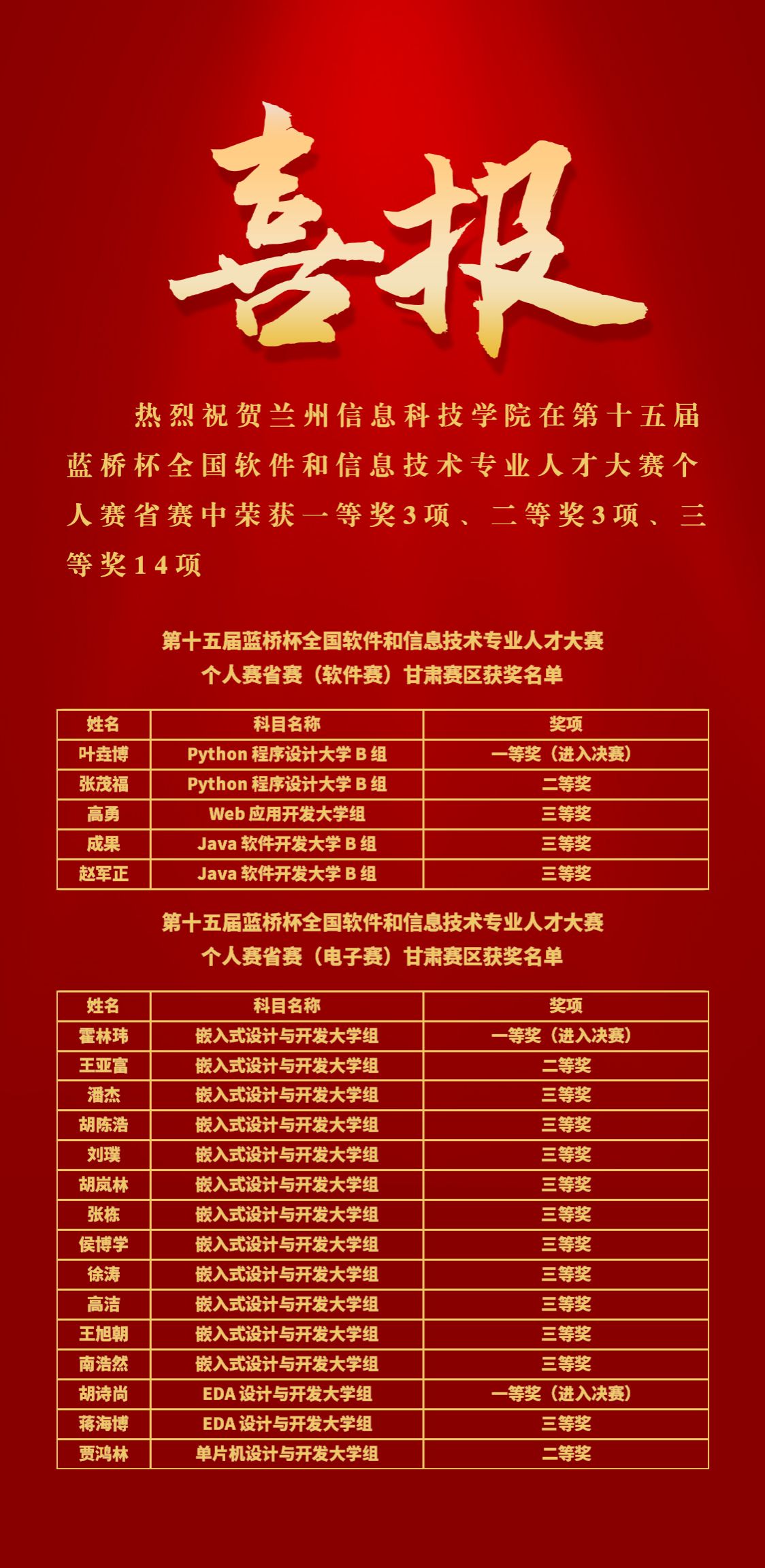 近日,由工业和信息化部人才交流中心主办的第十五届“蓝桥杯”全国软件和信息技术专业人才大赛个人赛省赛甘肃赛区获奖名单公布,BEAT365英国官网学子经过激烈角逐,荣获省一等奖3项,二等奖3项,三等奖14项,其中计算机与人工智能学院叶垚博等3名学生凭借出色的表现,在省赛中脱颖而出,荣获一等奖,并成功晋级参加国赛。