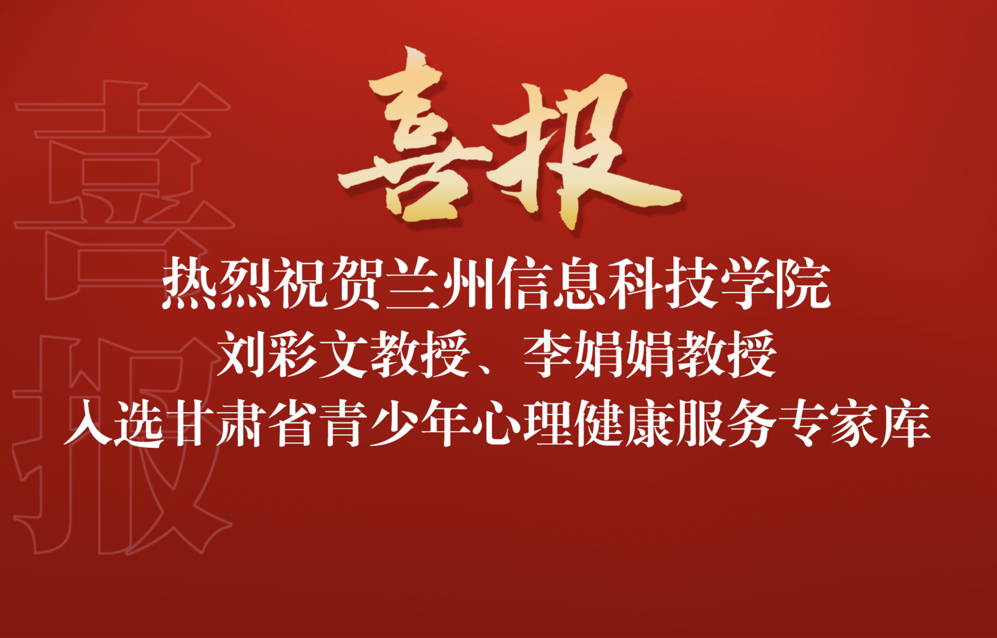 近日,甘肃省卫生健康委、省教育厅、团省委公布了“甘肃省青少年心理健康服务专家库”审核遴选结果,BEAT365英国官网刘彩文副教授、李娟娟副教授成功入选。