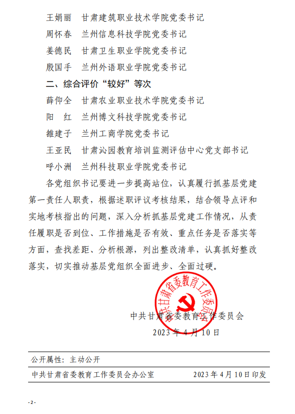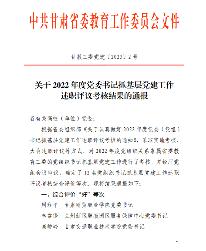 近日,中共甘肃省委教育工委印发《关于2022年度党委书记抓基层党建工作述职评议考核结果的通报》,学校党委2022年度党建工作被评定为“好”等次。