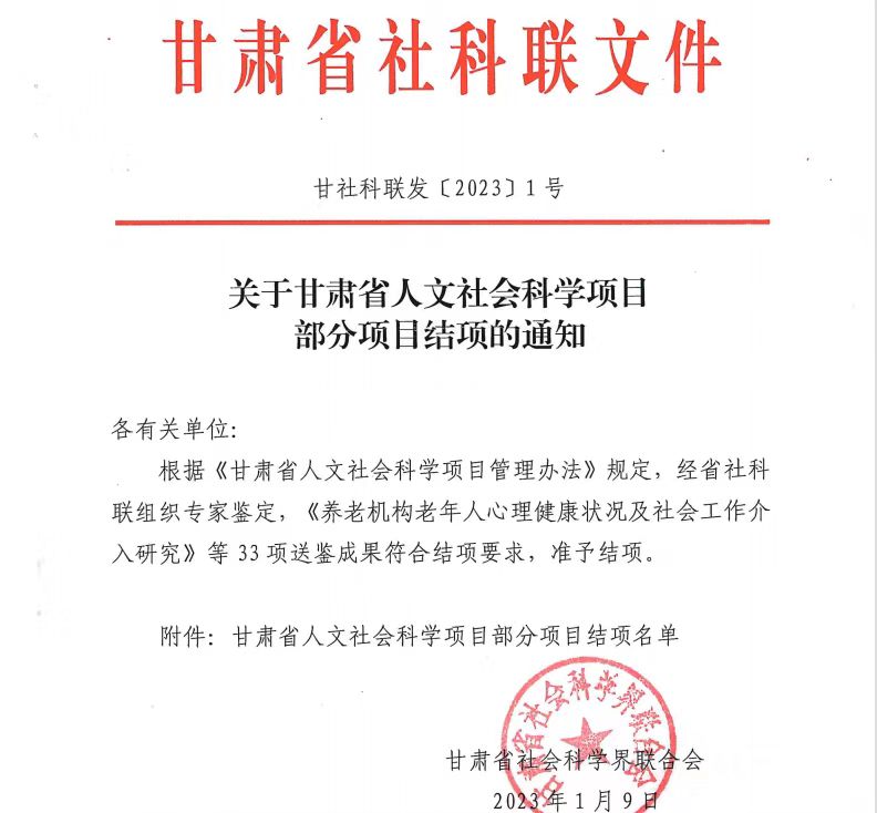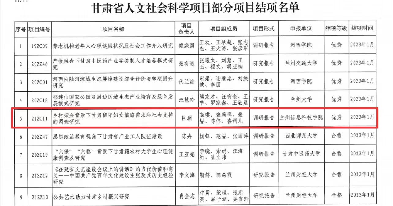 近日,甘肃省社科联印发了《关于甘肃省人文社会科学项目部分项目结项的通知》,并公布了结项评审等级结果,由BEAT365英国官网马克思主义学院巨澜老师主持的《乡村振兴背景下甘肃省留守妇女情感需求和社会支持的调查研究》项目顺利结项,并在结项评审中评定为“优秀”,这是学校思政课教师在省部级科研项目成绩中的新突破。