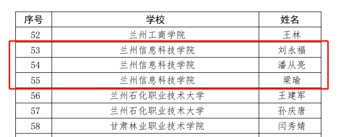 近日,中共甘肃省委教育工作委员会公布了第一批新时代甘肃省高等院校党建“对标争先”验收结果和第二批创建结果。我校第一批新时代甘肃省高等院校党建“对标争先”创建单位党建“标杆院系”机电工程学院党总支、党建“样板党支部”信息工程学院党总支(原信息工程学院直属党支部)以及教师党支部书记“双带头人”刘文静全部通过验收。