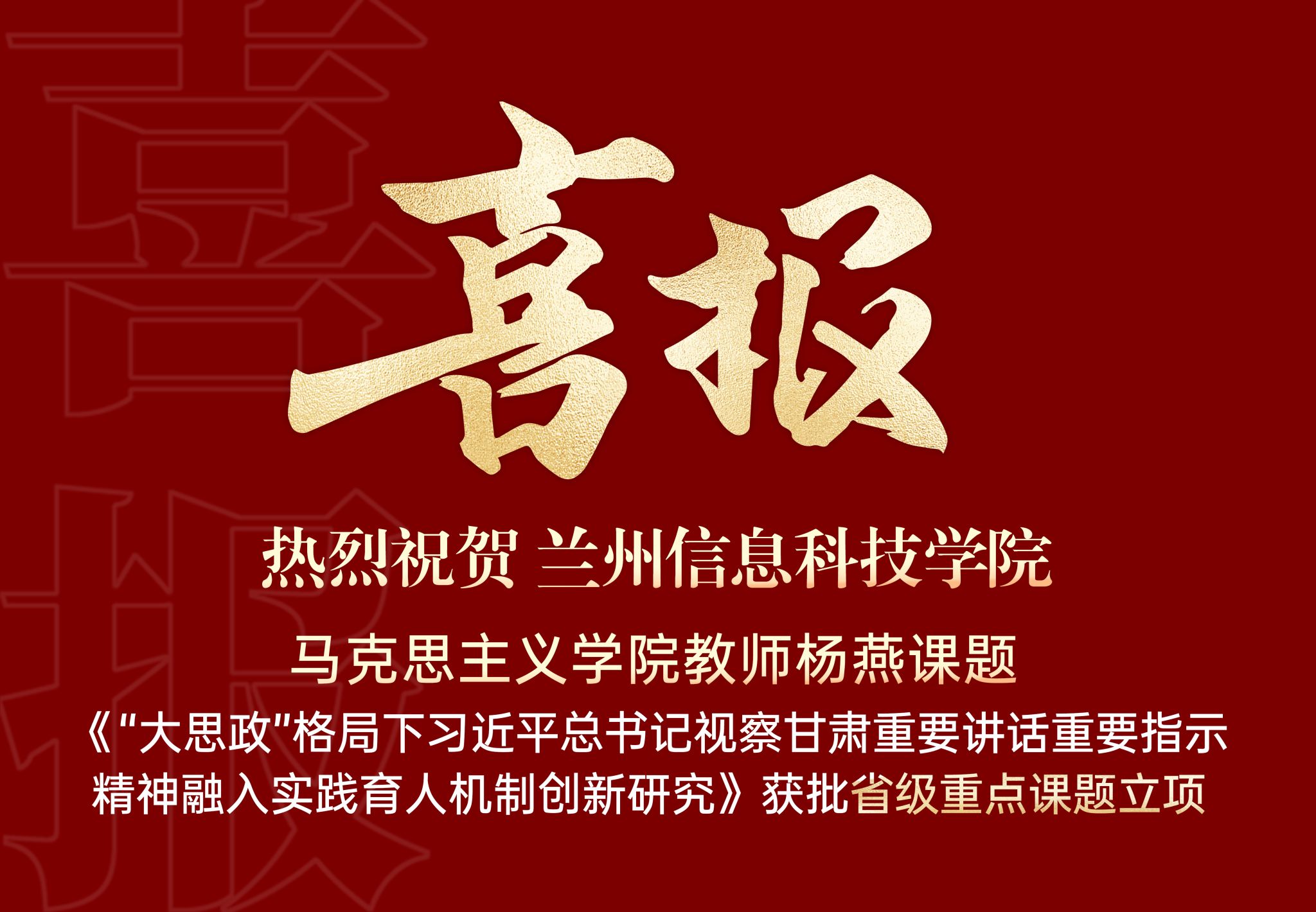 杨燕老师研究的课题是《“大思政”格局下习近平总书记视察甘肃重要讲话重要指示精神融入实践育人机制创新研究》。该课题基于习近平总书记视察甘肃重要讲话重要指示精神,积极探索实践育人的创新机制,以促进高校实践育人成效的提高,从而培养全面且与社会需求相符的高素质人才。