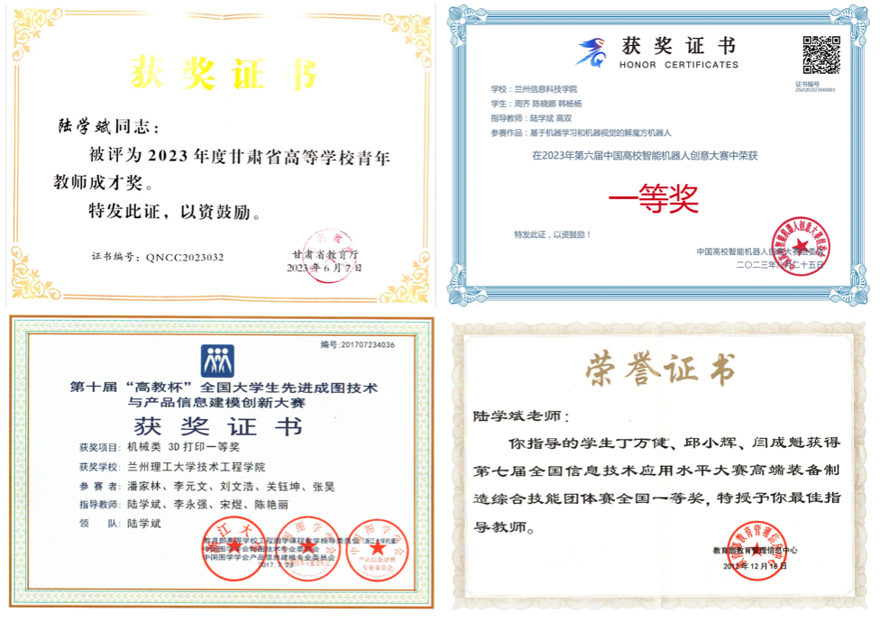 近年来,陆学斌先后荣获“甘肃省科学技术进步”二等奖、三等奖各1项,“甘肃省机械工程学会科技进步”二等奖4项、三等奖2项,“青年教师成才奖” “教学新秀”“教学优秀奖”“教学竞赛二等奖”等荣誉,并指导学生参加教育部56项专业竞赛,获得国家级奖34项,省部级奖76项。2次被教育部教育管理信息中心评为最佳指导教师。