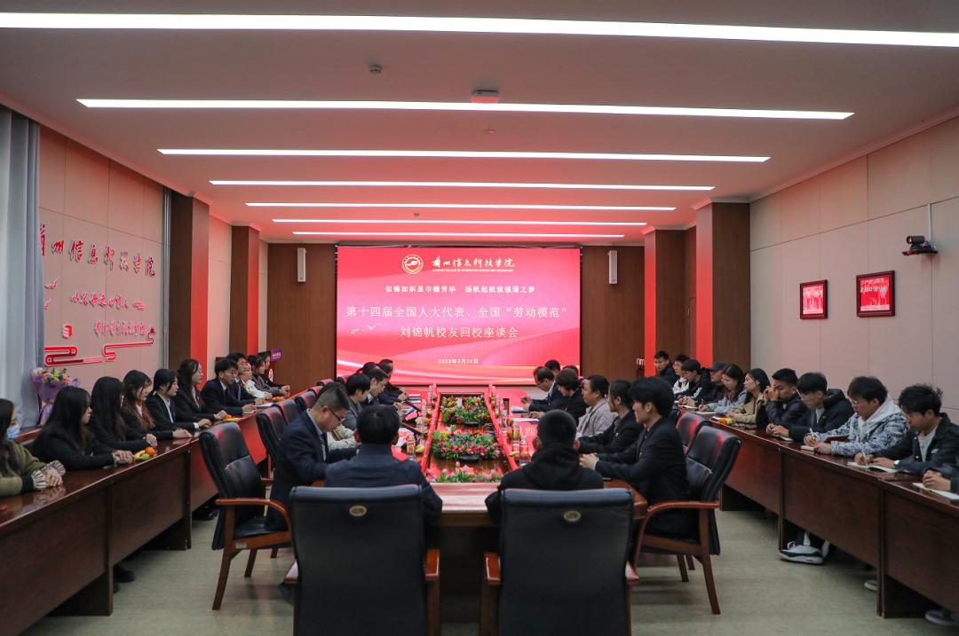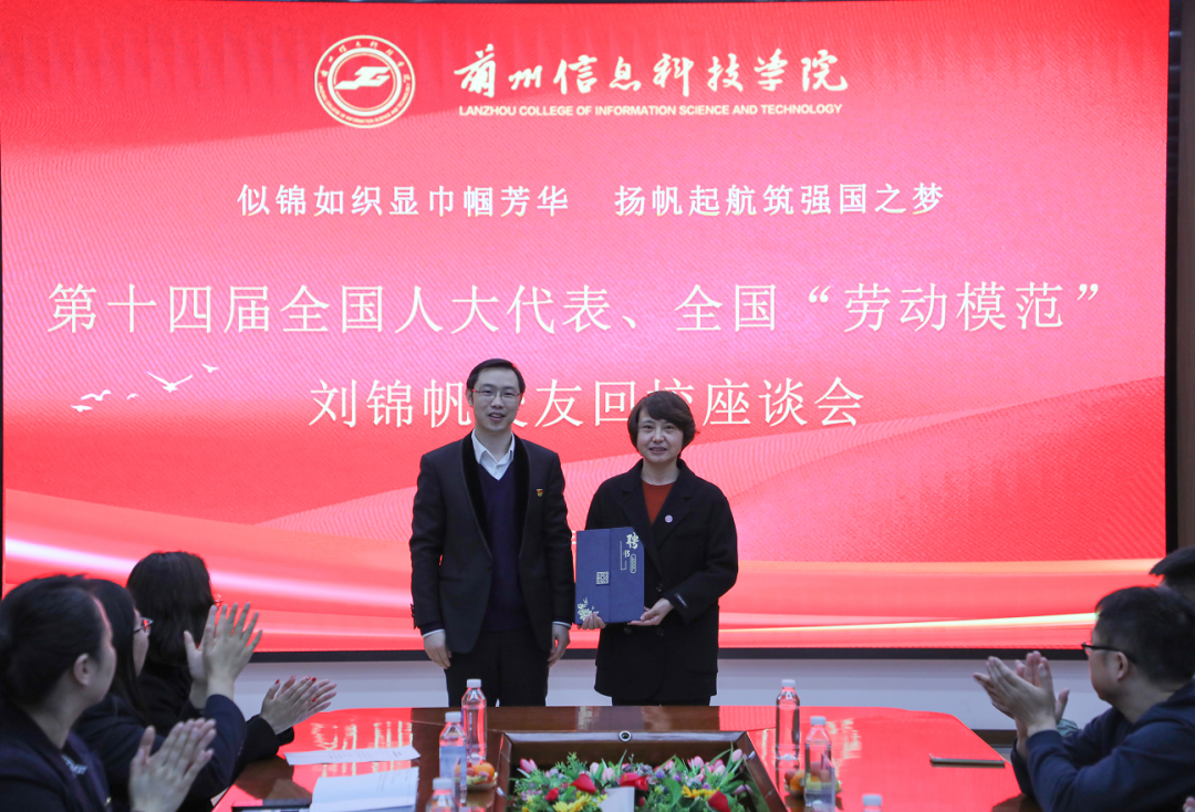 回忆校园故事,共叙恩师旧情。欢迎座谈会上,校长黄炜为刘锦帆颁发了客座教授聘书,并对刘锦帆的到来表示了热烈的欢迎。黄炜讲到,学校秉持着以父母之心育人的理念,培养了四万余名高素质应用型人才,刘锦帆校友此次的到来,必将在全校掀起学榜样学新风,争做新时代好青年的学习热潮。我们要向刘锦帆校友学习,要坚定理想信念,不忘初心、牢记使命;要秉持敬业精神,勤勉踏实,忘我工作,用智慧和汗水谱写知识型、技术型工人的精彩华章;要鼓励价值追求,甘于奉献,建功立业,挥洒无悔青春,贡献奋斗力量。他强调,学校将始终坚持以习近平新时代中国特色社会主义思想为指导,深入学习贯彻落实党的二十大精神,以“三抓三促”行动为契机,以实现每一位学生的职业成就和人生幸福为目标,不断推动学校高质量发展。刘锦帆表达了对母校的感恩,对老师和同学帮助的感谢。她讲到,当选人大代表,不仅是一份荣耀,更是一份沉甸甸的责任,是组织的信任,是人民的嘱托。她将肩负这份责任和嘱托,尽心尽力尽责的做好自己的工作。她希望学校能坚持应用型办学定位,坚定不移走高水平应用技术型大学发展之路,服务国家战略和区域经济发展,坚持为党育人、为国育才的初心和使命。