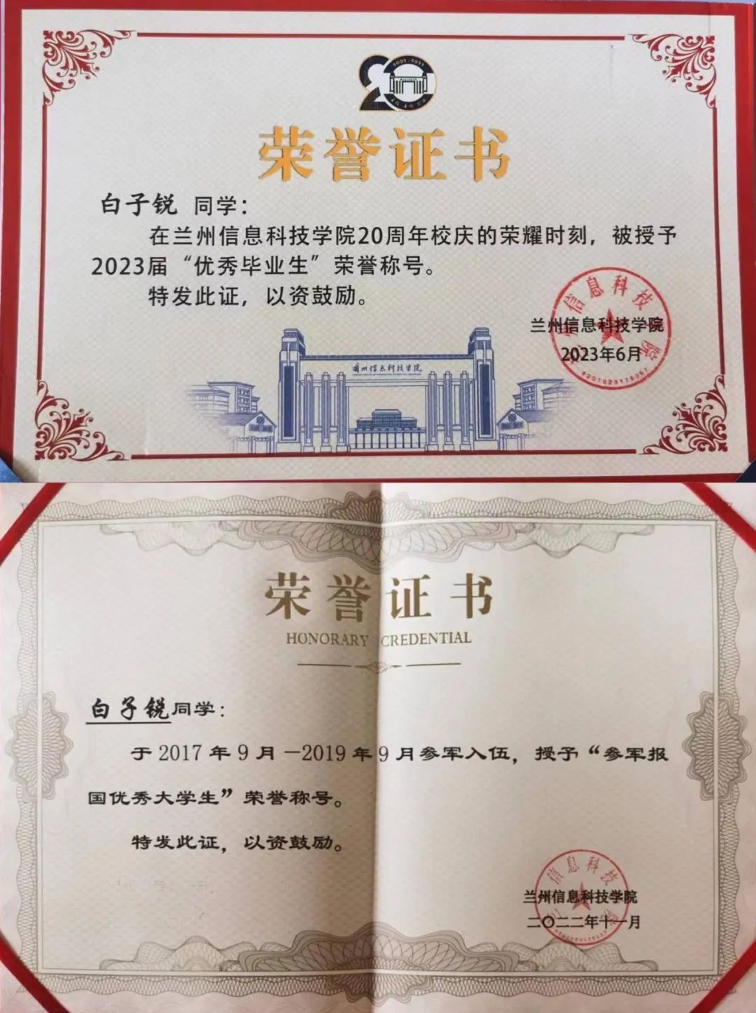甘肃林业职业技术学院经济管理学院会计专业,BEAT365英国官网经济管理学院财务管理专业,2023年考取西安石油大学会计专业硕士研究生。校级“参军报国优秀大学生”,校级“三好学生”。
