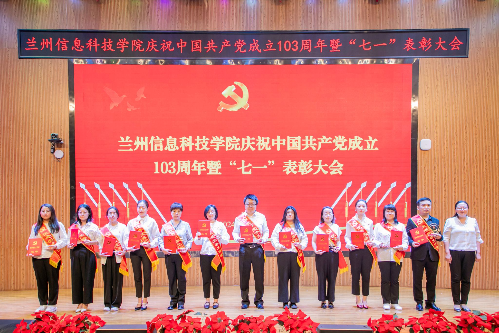 会上,周怀春总结了一年来学校党建工作和各项事业取得的新成效。他指出这些成绩的取得,得益于基层组织的战斗堡垒作用不断激发,和广大党员干部的先锋模范作用充分发挥。他代表学校党委向受到表彰的优秀个人、先进集体表示热烈祝贺,向全校各级党组织和广大党员同志致以节日问候。他向全校各级党组织和全体党员提出四点要求:一是提高站位,严格落实,高标准高质量完成党纪学习教育。全校各级党组织和全体党员要提高政治站位,强化政治担当,善始善终、慎终如始,以学纪知纪明纪促进遵纪守纪执纪,推动党纪学习教育走深走实、见行见效。二是落实责任,从严治党,充分发挥党组织战斗堡垒作用。各二级党组织要全面贯彻新时代党的建设总要求,严格按照工作要求,对标党建工作“标杆院系”的建设标准,在组织发动、凝聚共识、形成氛围、推动工作上展现新作为,在思想政治工作、师德建设、学风建设上取得新成效。三是严格要求,主动作为,充分发挥共产党员先锋模范作用。作为教师党员,要做师德师风建设的表率,做立德树人的育人模范,做一名学生爱戴的好老师;作为学生党员,要做品学兼优的青年模范,做社会主义合格建设者和接班人。四是提升境界,凝心聚力,汇集培育时代新人的强大动能。全校青年师生要准确把握爱国主义本质,深刻领悟习近平新时代中国特色社会主义思想,打心底听党话、感党恩、跟党走,将“小我梦”主动融入“中国梦”,在实现中华民族伟大复兴的征程中书写青春华章。