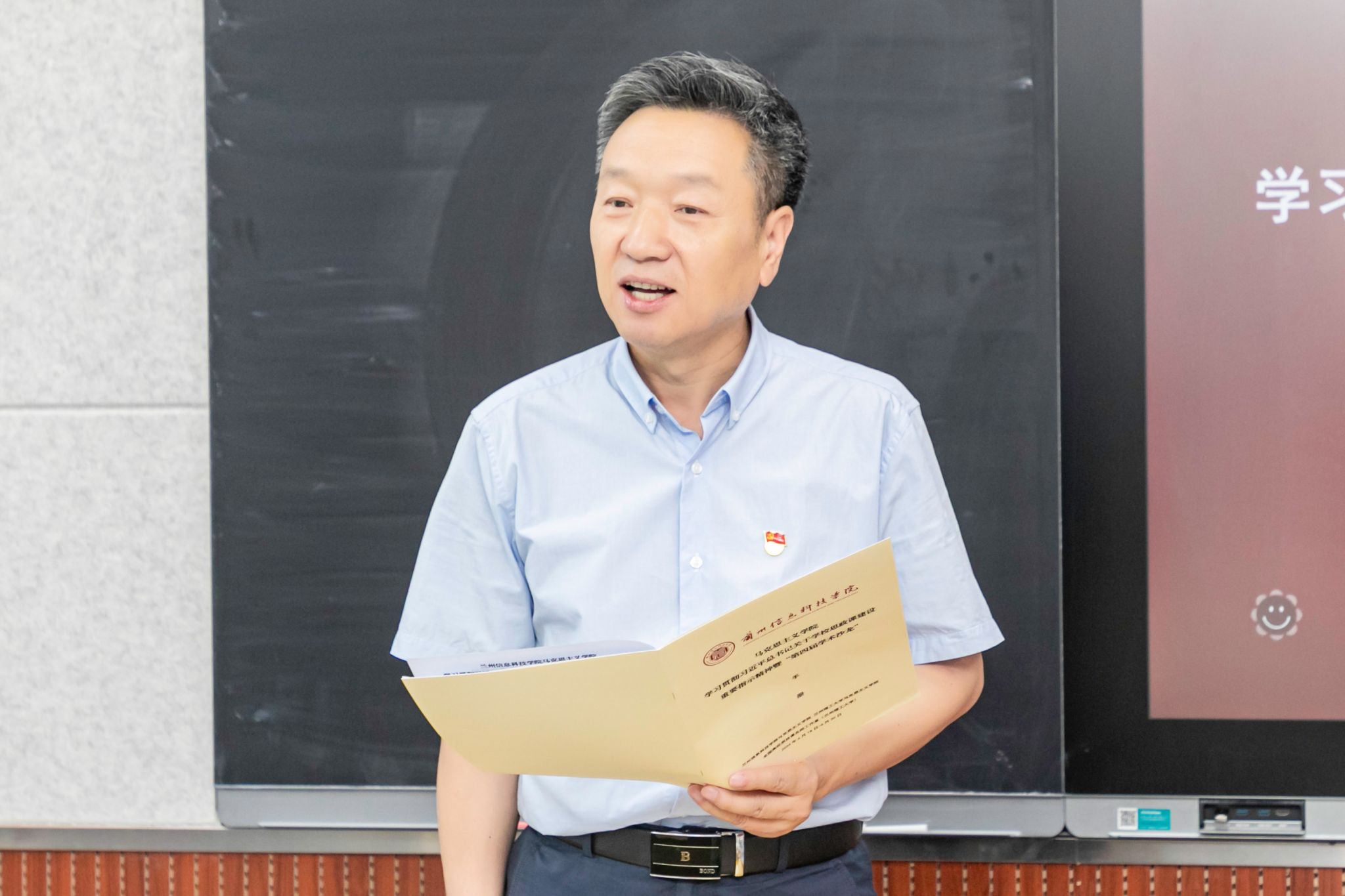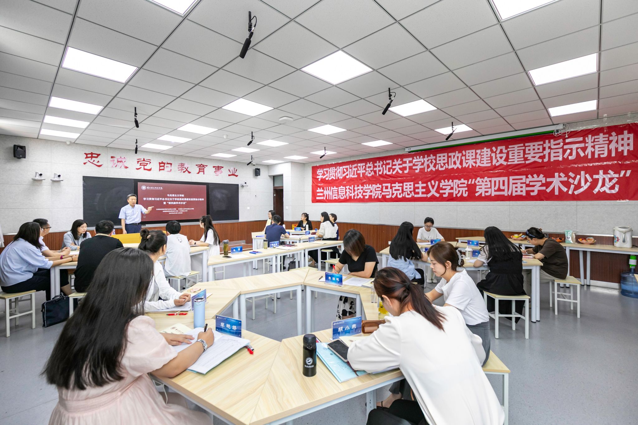 本次“学术沙龙”分五个环节,分别是:马克思主义学院教师集中学习;兰州理工大学马克思主义学院院长、全国思政课名师工作室主持人饶旭鹏教授做题为“学习贯彻习近平总书记对学校思政课建设的重要指示,做新时代优秀思政课教师”的主旨报告;兰州理工大学马克思主义学院硕士生导师刘海霞教授做题为“提升思政课教师科研产出能力必备的‘六个一’”的辅导报告;兰州理工大学马克思主义学院硕士生导师张铁军教授做题为“为什么要提‘第二个结合’?怎样‘结合’——以‘习近平新时代中国特色社会主义思想概论’课程为例”的学术报告以及马克思主义学院骨干教师代表做思政课教学专题分享研讨。