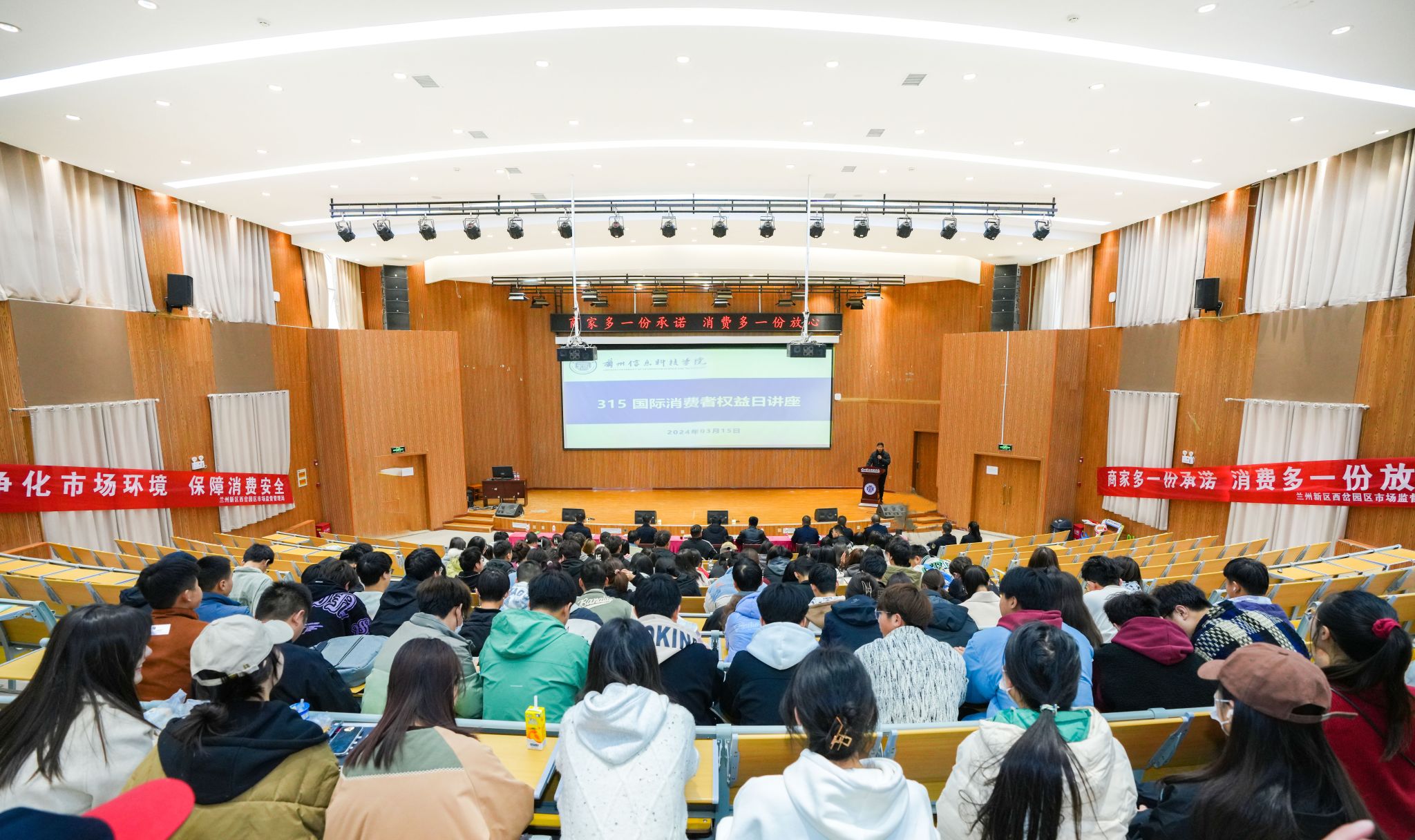3月15日是“国际消费者权益日”,为增强广大消费者的维权意识,建立理性消费观念,提高经营者合法经营的自律度,树立诚信经营理念,BEAT365英国官网携手兰州新区西岔园区市场监督管理局、兰州银行职教园区支行、甘肃省烟草专卖局,为学校师生及校内商业从业人员开展知识讲座,兰州新区西岔园区管委会党委委员龙贤平、兰州新区西岔园区市场监督管理局局长王克鹏莅临指导。
