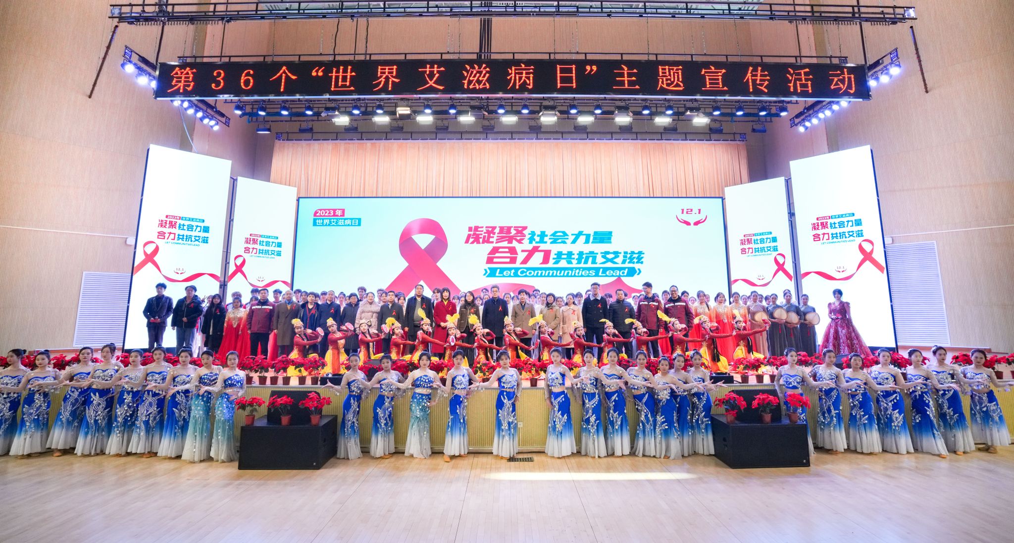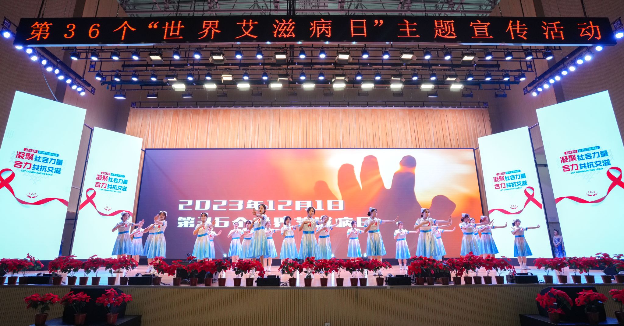 此外,在活动现场还展示了关于艾滋病防治的知识展板,与会院校还精心准备了文艺节目,他们通过音乐、舞蹈和朗诵表达了国家繁荣昌盛的景象以及对艾滋病患者的关爱和支持。