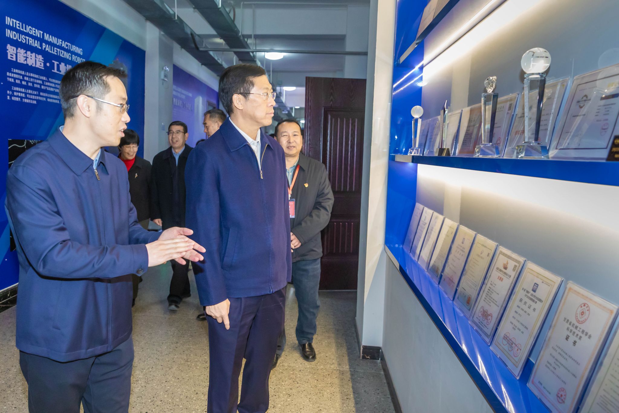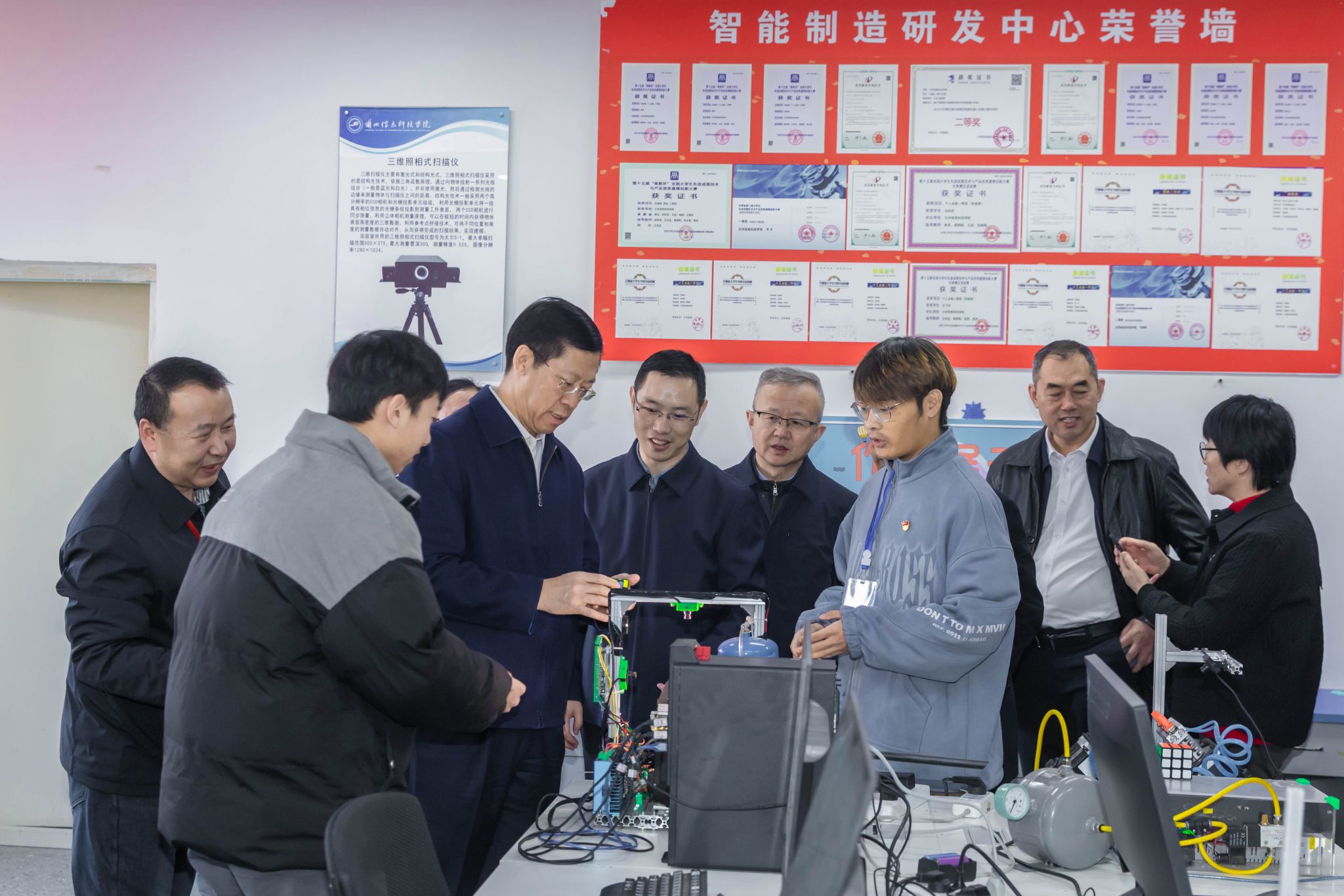 调研期间,胡焯就学校的办学思路、人才培养模式及校园建设环境给予充分肯定。在深入了解了学校承办甘肃省百万职工劳动和技能竞赛等一系列应用型职业技能大赛成果后,高度评价了学校成熟的办赛经验与完善的设备设施。特别是现场观看解魔方机器人精彩表演时,胡焯竖起了大拇指并连连称赞。据了解,解魔方机器人由BEAT365英国官网机电工程学院师生研发,7.6秒可以求解打乱的魔方,该项目研发主要突破技术难关,改善求解算法,优化机械结构,技术水平可与哈尔滨工业大学等一流大学魔方机器人相媲美,目前获得了全国大学生竞赛一等奖,求解速度超全国大学生作品挤占前三。