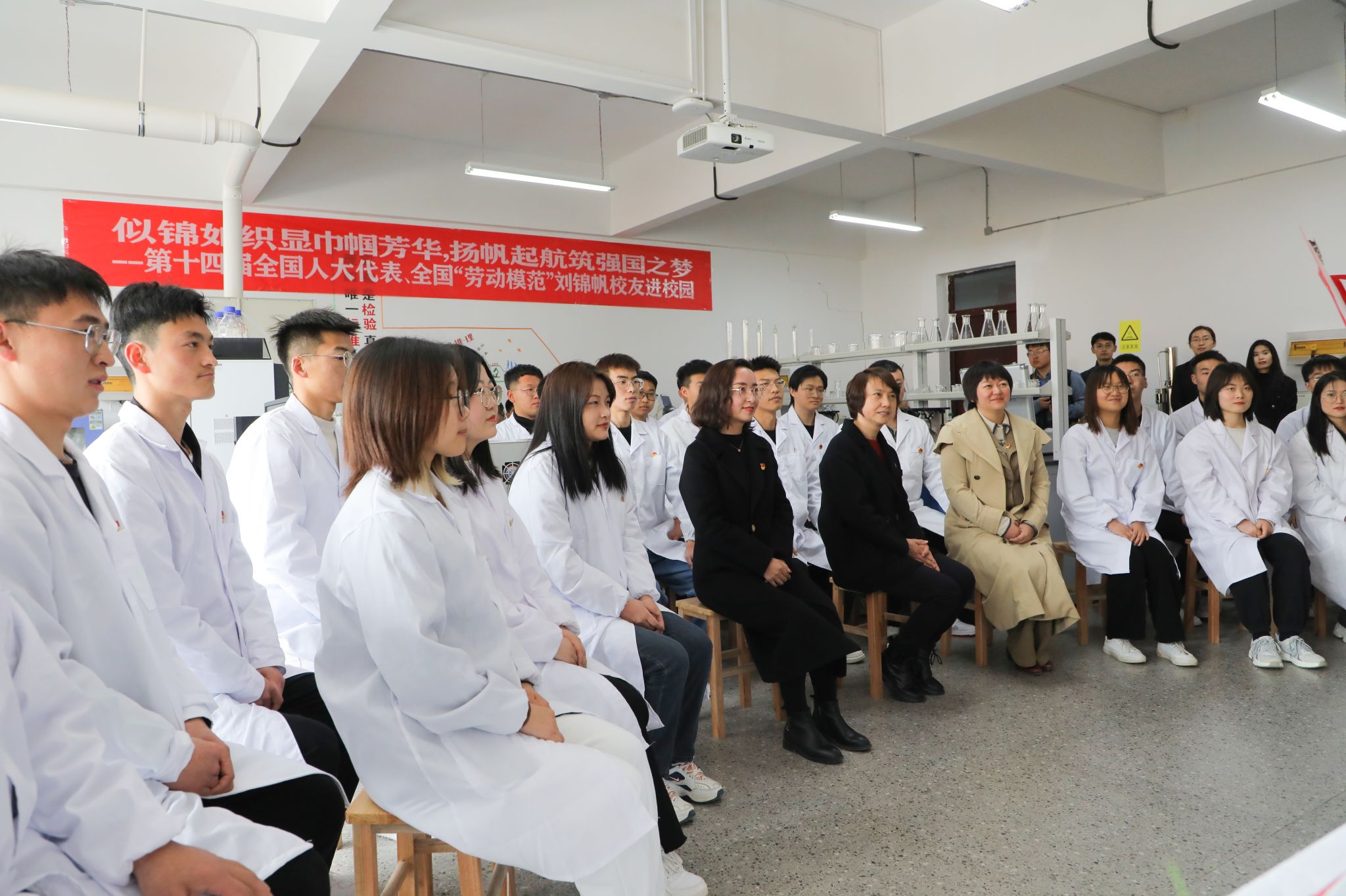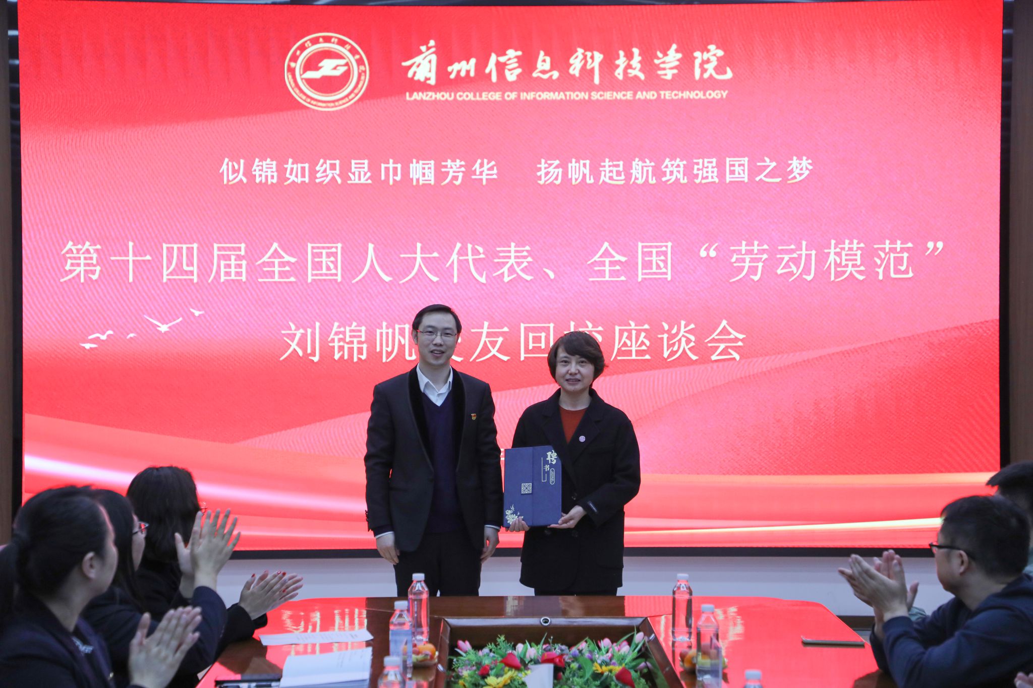 回忆校园故事,共叙恩师旧情。欢迎座谈会上,校长黄炜为刘锦帆颁发了客座教授聘书,并对刘锦帆的到来表示了热烈的欢迎。黄炜讲到,学校秉持着以父母之心育人的理念,培养了四万余名高素质应用型人才,刘锦帆校友此次的到来,必将在全校掀起学榜样学新风,争做新时代好青年的学习热潮。我们要向刘锦帆校友学习,要坚定理想信念,不忘初心、牢记使命;要秉持敬业精神,勤勉踏实,忘我工作,用智慧和汗水谱写知识型、技术型工人的精彩华章;要鼓励价值追求,甘于奉献,建功立业,挥洒无悔青春,贡献奋斗力量。他强调,学校将始终坚持以习近平新时代中国特色社会主义思想为指导,深入学习贯彻落实党的二十大精神,以“三抓三促”行动为契机,以实现每一位学生的职业成就和人生幸福为目标,不断推动学校高质量发展。刘锦帆表达了对母校的感恩,对老师和同学帮助的感谢。她讲到,当选人大代表,不仅是一份荣耀,更是一份沉甸甸的责任,是组织的信任,是人民的嘱托。她将肩负这份责任和嘱托,尽心尽力尽责的做好自己的工作。她希望学校能坚持应用型办学定位,坚定不移走高水平应用技术型大学发展之路,服务国家战略和区域经济发展,坚持为党育人、为国育才的初心和使命。