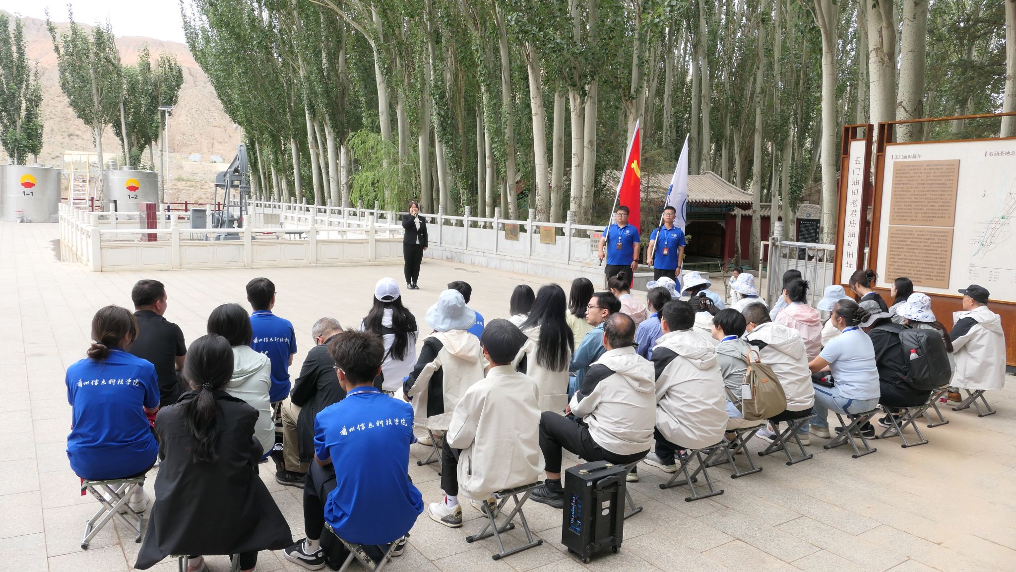 午后,师生们踏上红色实践教学之旅。在孙建初纪念碑前,郑璇老师动情讲述“中国石油之父”踏遍祁连、为国寻油的传奇人生;梁洁老师通过纪念馆的珍贵史料,将科技报国的赤子情怀娓娓道来。老一井旁,李颖老师带领学员“重走铁人路”,李樱桃老师以互动教学点燃“工业报国”的传承之火;古朴的老君庙下,孙玉娇老师解密石油开采与庙宇的百年渊源;玉门解放门前,马红秀老师以鲜活的英雄史诗,再现这座城市的光荣记忆。