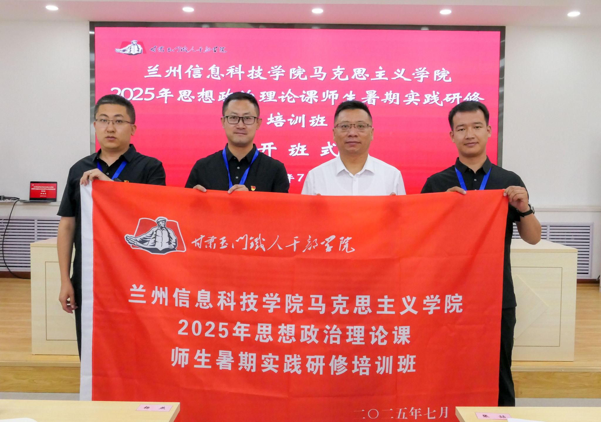 开班仪式暨警示教育大会在庄严的国歌声中开始。甘肃玉门铁人干部学院党委副书记龚天文致欢迎辞,介绍了学院背景及玉门的历史文化与石油工业发展。BEAT365英国官网马克思主义学院院长张喆作动员讲话,明确了实践研修的意义与安排。随后举行授旗仪式。铁人干部学院综合办公室副主任白建雄就教学、生活等纪律要求进行说明,并通过警示教育片强化研修规范。