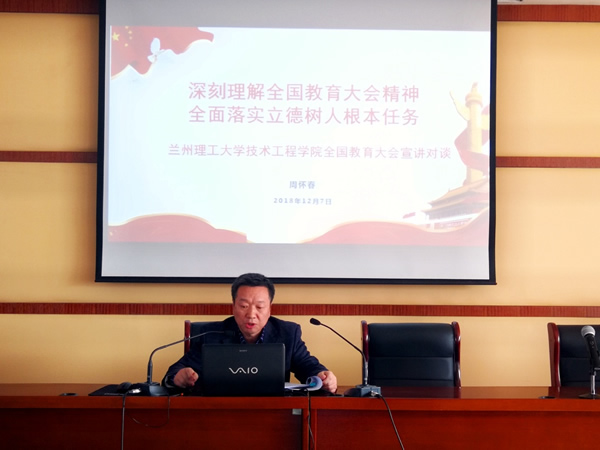 为切实推动全校师生深入理解和把握全国教育大会精神,认真做好大会精神的学习宣传贯彻落实工作,引导广大师生把思想统一到会议精神上来,在前期学习宣传贯彻工作的基础上,12月7日下午,学校在砺志楼行政办公区五楼报告厅举行了全国教育工作大会精神宣讲对谈,“甘肃教育百人宣讲团”成员、学院党委书记周怀春作了题为《深刻理解全国教育大会精神 全面落实立德树人根本任务》的宣讲。全校教职工党员、学生党员代表200余人参加了宣讲会。