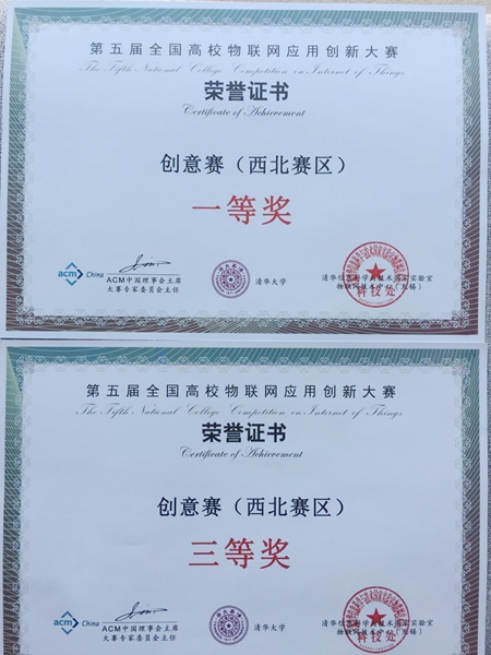 2018年4月15日,我院学生在第五届全国高校物联网应用创新大赛西北赛区决赛中喜获佳绩。此次决赛,我院共有两件作品入围,其中由2015级能源与动力工程1班陈琳等五名同学制作的“跳舞机器人”以第二名的成绩荣获一等奖,并成功晋级全国总决赛;由2015级物联网2班吕归龙等五名同学制作的“太阳能智能温室”荣获三等奖。