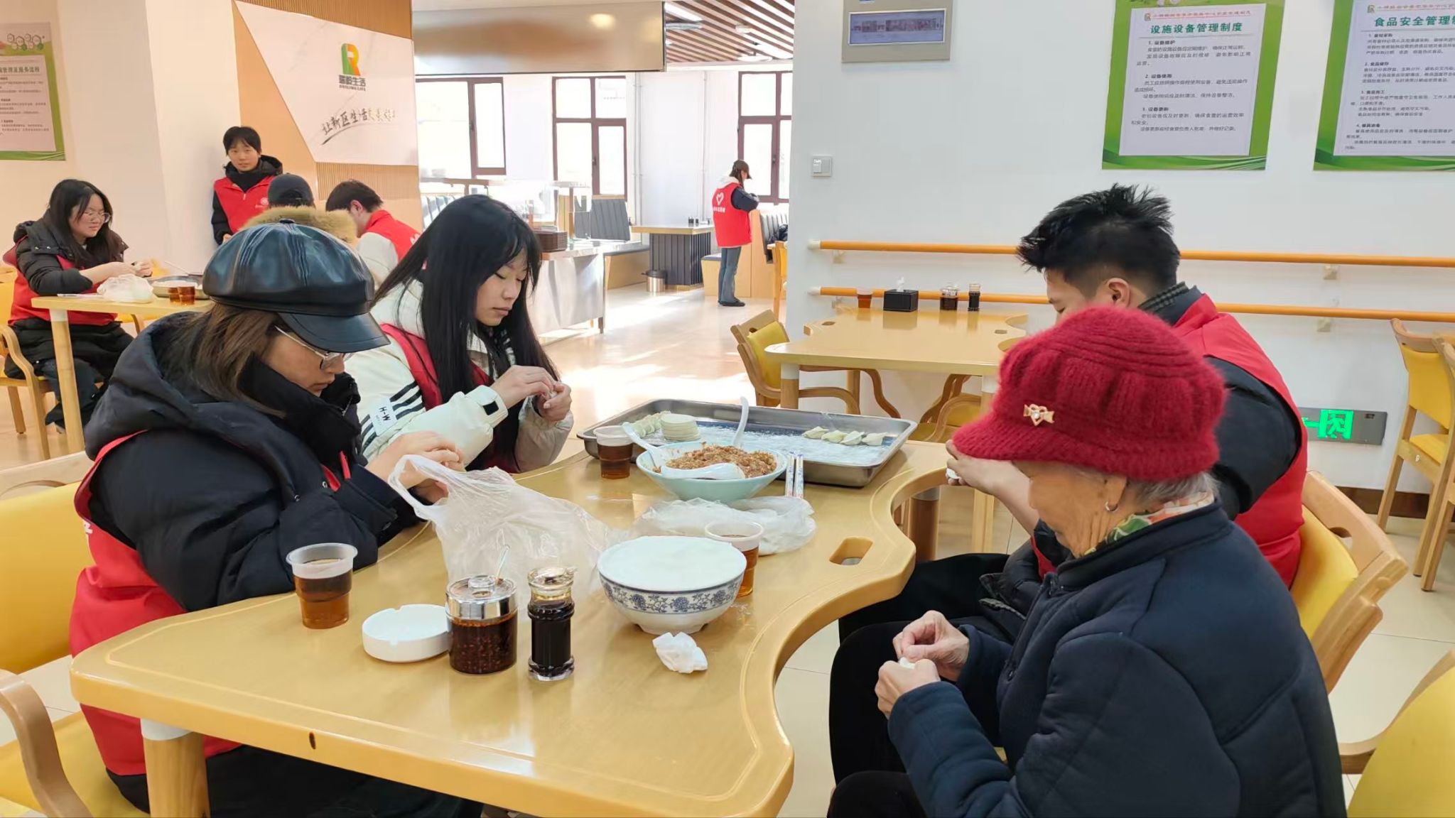 志愿者们抵达养老中心后,有序布置场地、准备食材,与老人们围坐一堂、拉拉家常,倾听老人们讲述冬至时节的民俗故事与往昔岁月的温暖回忆。一个个饱满圆润的饺子也在欢声笑语中跃然案上。