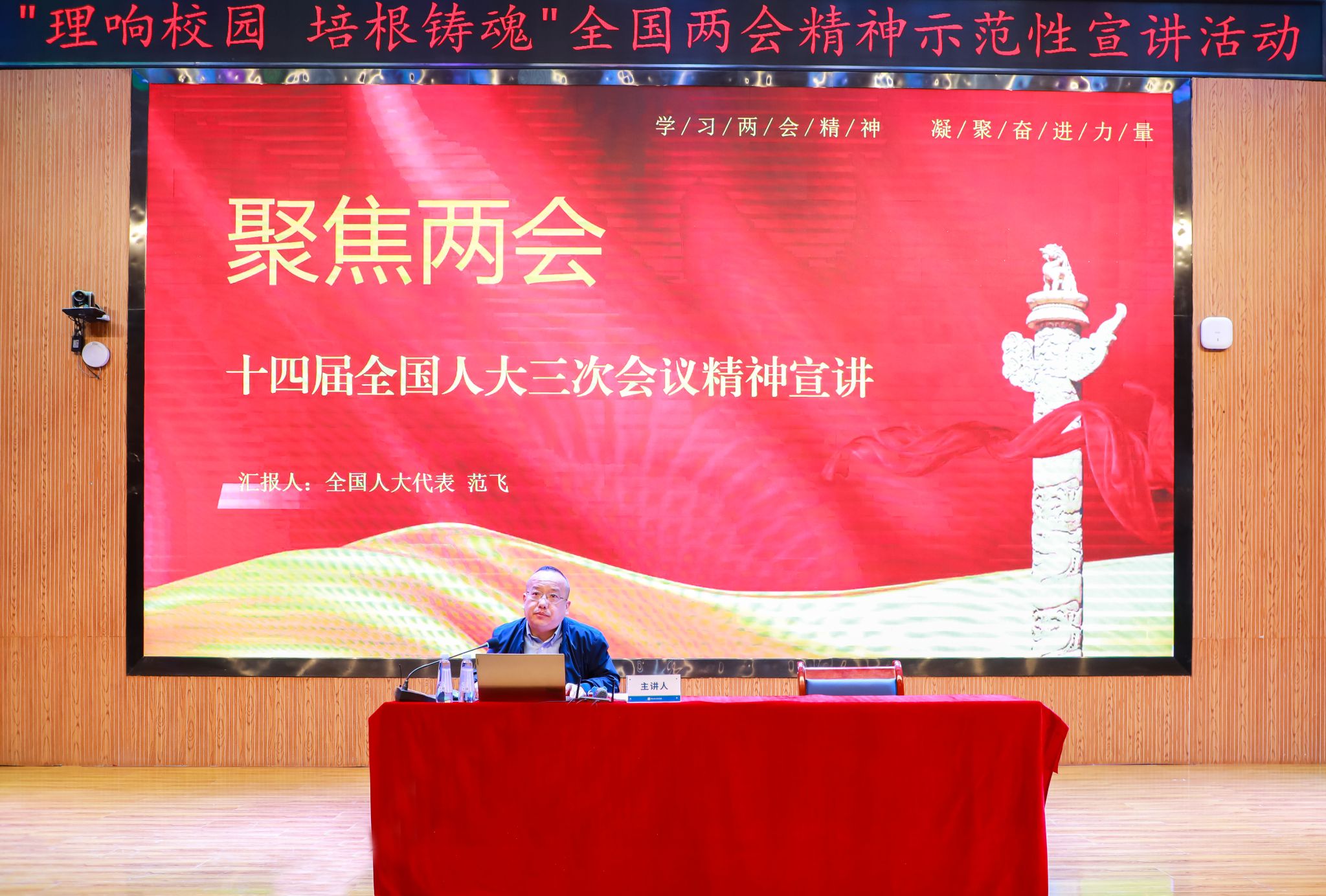 宣讲会上,范飞以《十四届全国人大三次会议精神宣讲》为题,重点传达了大会的概况与丰硕的会议成果、宣讲了习近平总书记在大会期间发表的重要讲话精神,并结合实际解读了政府工作报告,详细介绍了甘肃代表团履职情况。范飞院长的讲解旁征博引,通过详实的数据将两会精神深入浅出地呈现出来,为师生全面准确理解两会精神提供了系统性、针对性指导。张世煜围绕《两会精神与习近平三次视察甘肃》主题进行了分享。他以青年学生的视角,深入阐释习近平总书记视察甘肃重要讲话重要指示精神,通过结合鲜活事例,生动诠释了新时代青年“以青春之我传递信仰之火”的使命与担当。