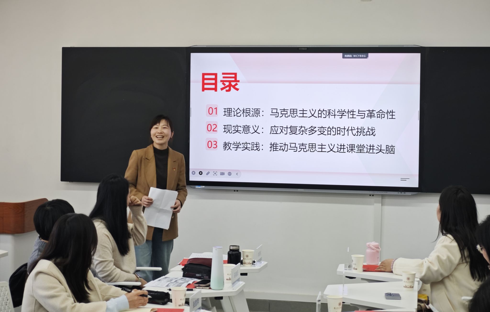 随后分别由中国近现代史纲要教研室教师李艳娇、毛泽东思想和中国特色社会主义理论体系概论教研室教师习璐和形势与政策教研室教师马晓跃分别分享了两会精神融入相关思政课的专题教学设计;马克思主义基本原理教研室教师胡小燕围绕“坚持马克思主义在意识形态领域指导地位的根本制度”这一主题,分享了如何推动马克思主义在意识形态领域的指导地位在课堂上落地生根的理论与实践思考。