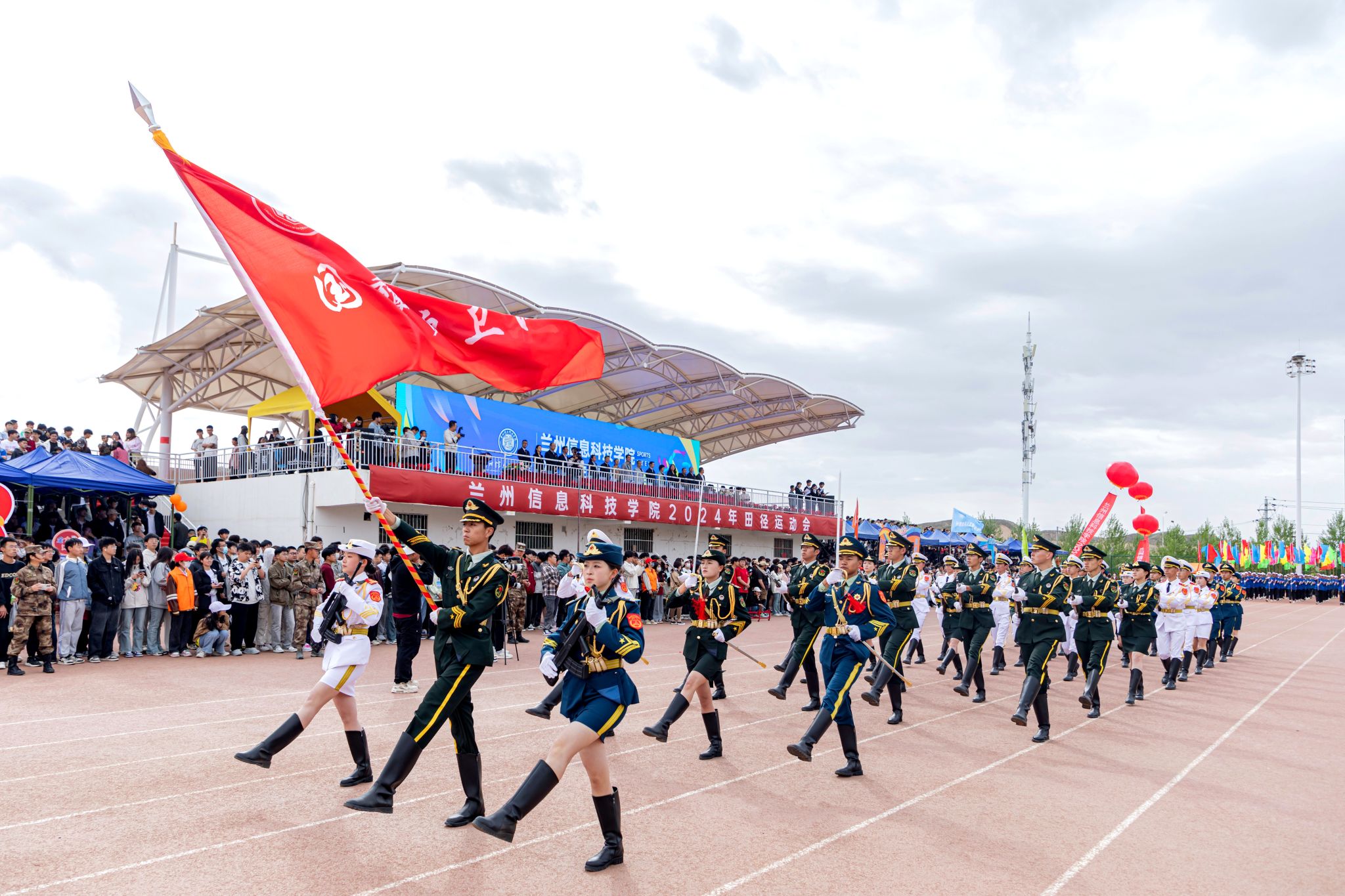 鼓声激荡,彩旗飘扬,开幕式在激昂的音乐声中开始。国旗护卫队、国防后备营、彩旗队、校徽校训方队、运动员代表队、裁判员代表队等22个方队,迈着铿锵有力的步伐,神采飞扬地走过主席台,用激情嘹亮的口号和特色独具的表演展现出兰科师生激情澎湃、朝气蓬勃的风采。跆拳道、体育舞蹈、啦啦操、特色扇子舞等表演方队给全体师生带来一场视觉盛宴。校长程兰华在《青春恰似火奔跑正当时》致辞时提出三点希望,一是希望全体同学都能走下网络,走出宿舍,走进操场,参与到运动会中来;二是希望全体裁判员和工作人员严格按章执裁,做到公平、公正,以细致的工作为运动会做好服务;三是希望全体志愿者弘扬“奉献、友爱、互助、进步”的志愿服务精神,传递温暖,播种文明,让赛场成为师生情感互通的重要场所,让赛场成为别样的和谐课堂。