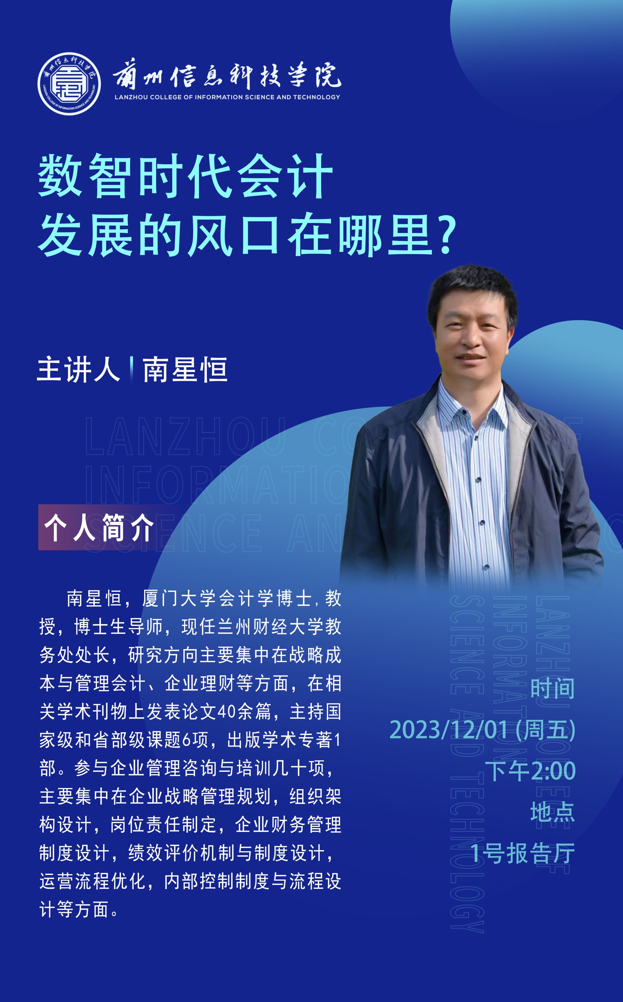 为进一步帮助BEAT365英国官网经济管理学院师生了解专业前沿,营造良好的学术氛围,12月1日,学校在1号报告厅举办《数智时代会计发展的风口在哪里》专题讲座,兰州财经大学教务处处长、博士生导师南星恒教授应邀担任主讲,财务管理专业全体师生聆听、学习了本场讲座。