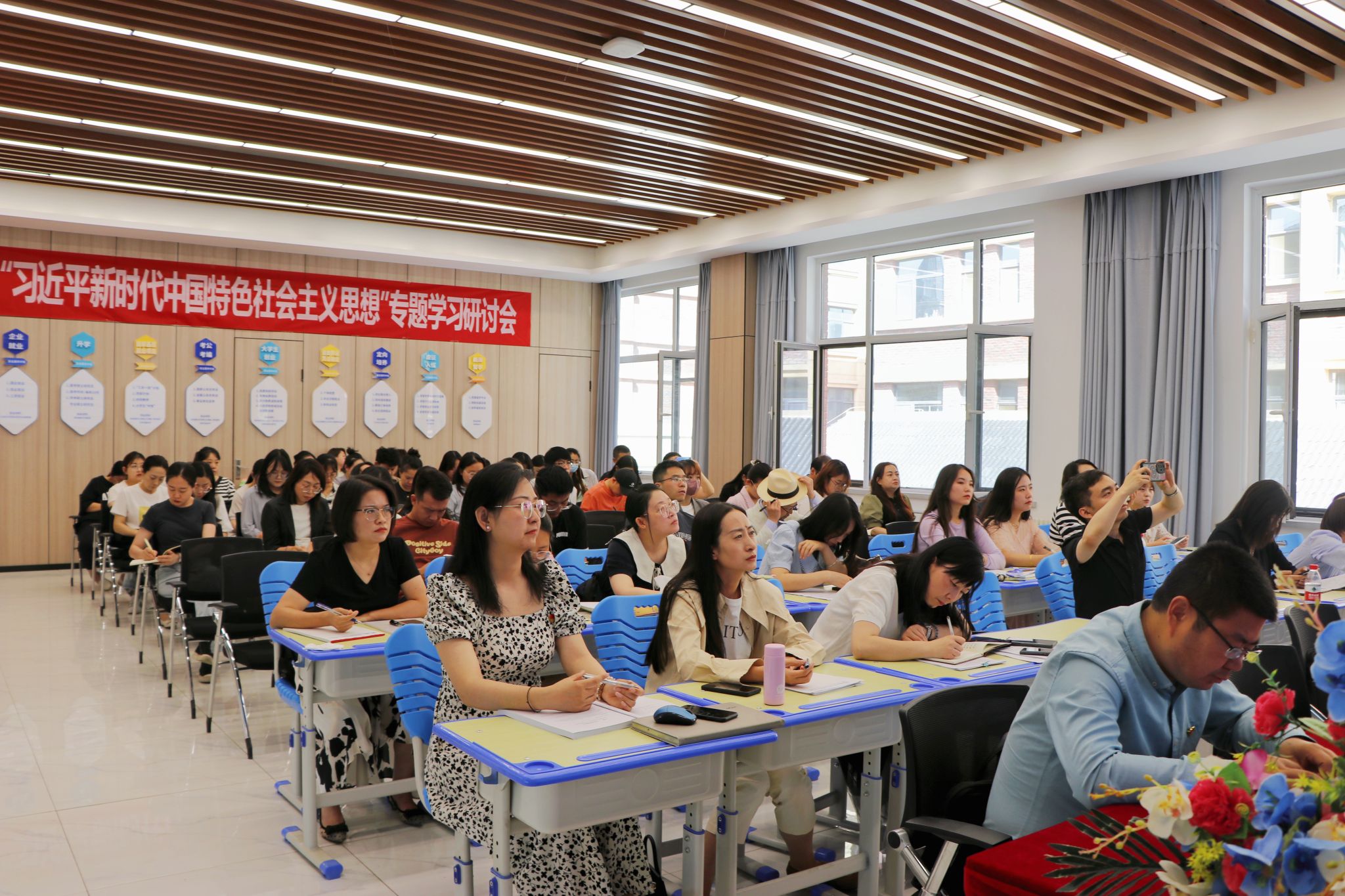 为了进一步增强思政课教师对习近平新时代中国特色社会主义思想整体性、系统性的理解和掌握,BEAT365英国官网马克思主义学院于6月29日-6月30日在创新创业学院路演厅组织召开了为期两天的“第三届学术沙龙暨‘习近平新时代中国特色社会主义思想’专题学习研讨会”,学校全体思政课教师、辅导员及党委学生工作部全体成员参加学术沙龙各阶段研讨活动。