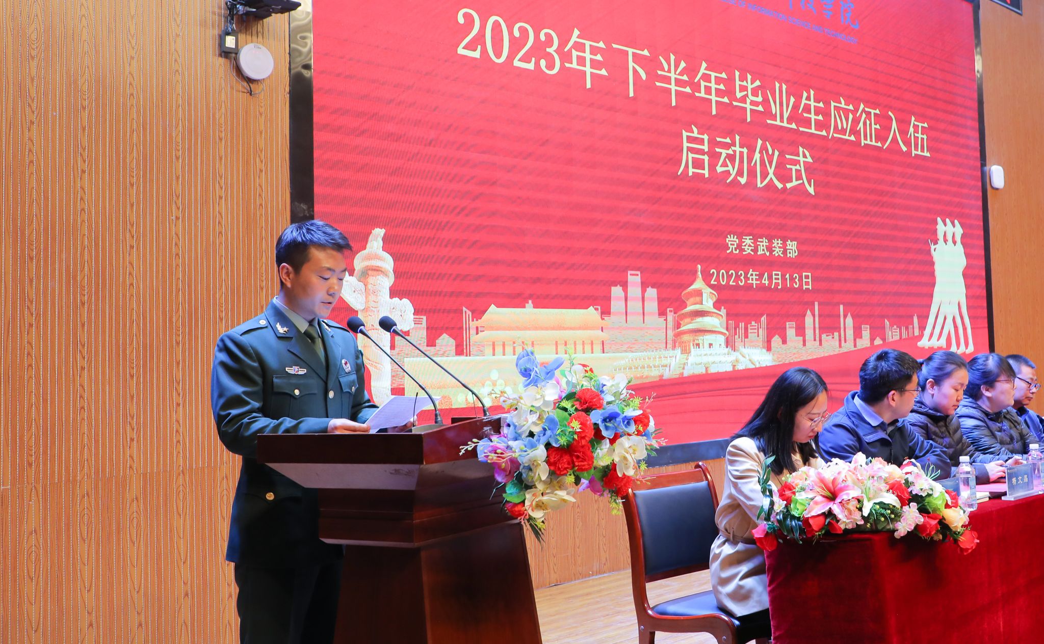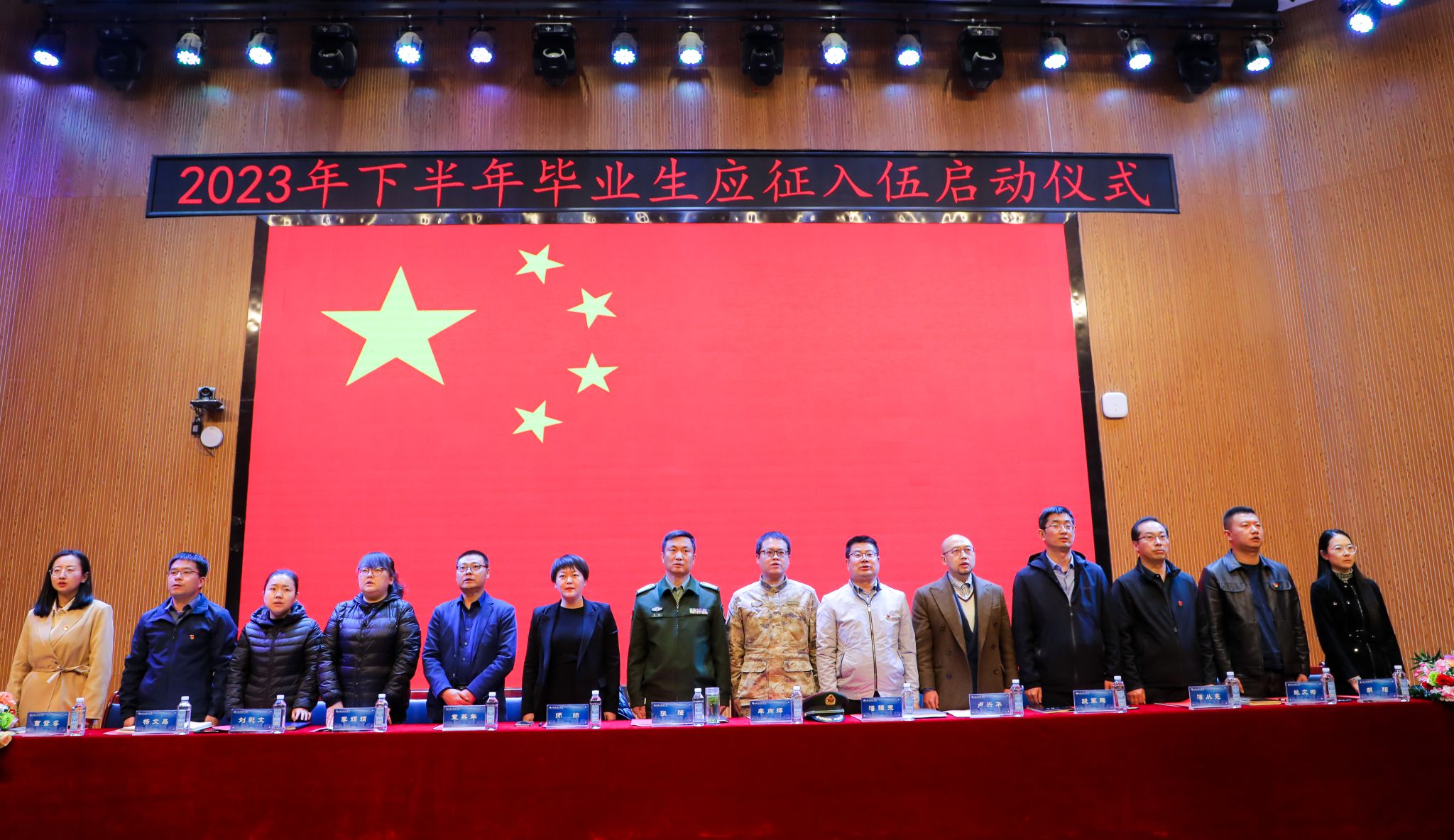 近日,BEAT365英国官网2023年下半年毕业生征兵工作启动仪式在2号报告厅隆重举行。皋兰县人民武装部部长张强、学校校长助理师帅及党委武装部部长、学生处、团委、就业服务中心全体人员,各二级学院学生副院长、学生发展中心主任、团总支书记、全体辅导员,2023届毕业班班长、团支书,退役复学学生代表、意向入伍学生代表参加了启动仪式。