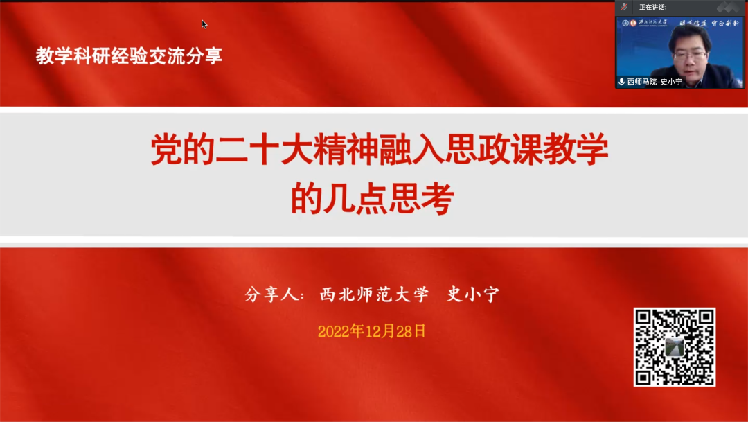 12月28日,马克思主义学院邀请甘肃省委党的二十大精神宣讲团成员、西北师范大学马克思主义学院院长史小宁教授为全体思政课教师开展了主题为“党的二十大精神融入思政课教学”专题讲座。