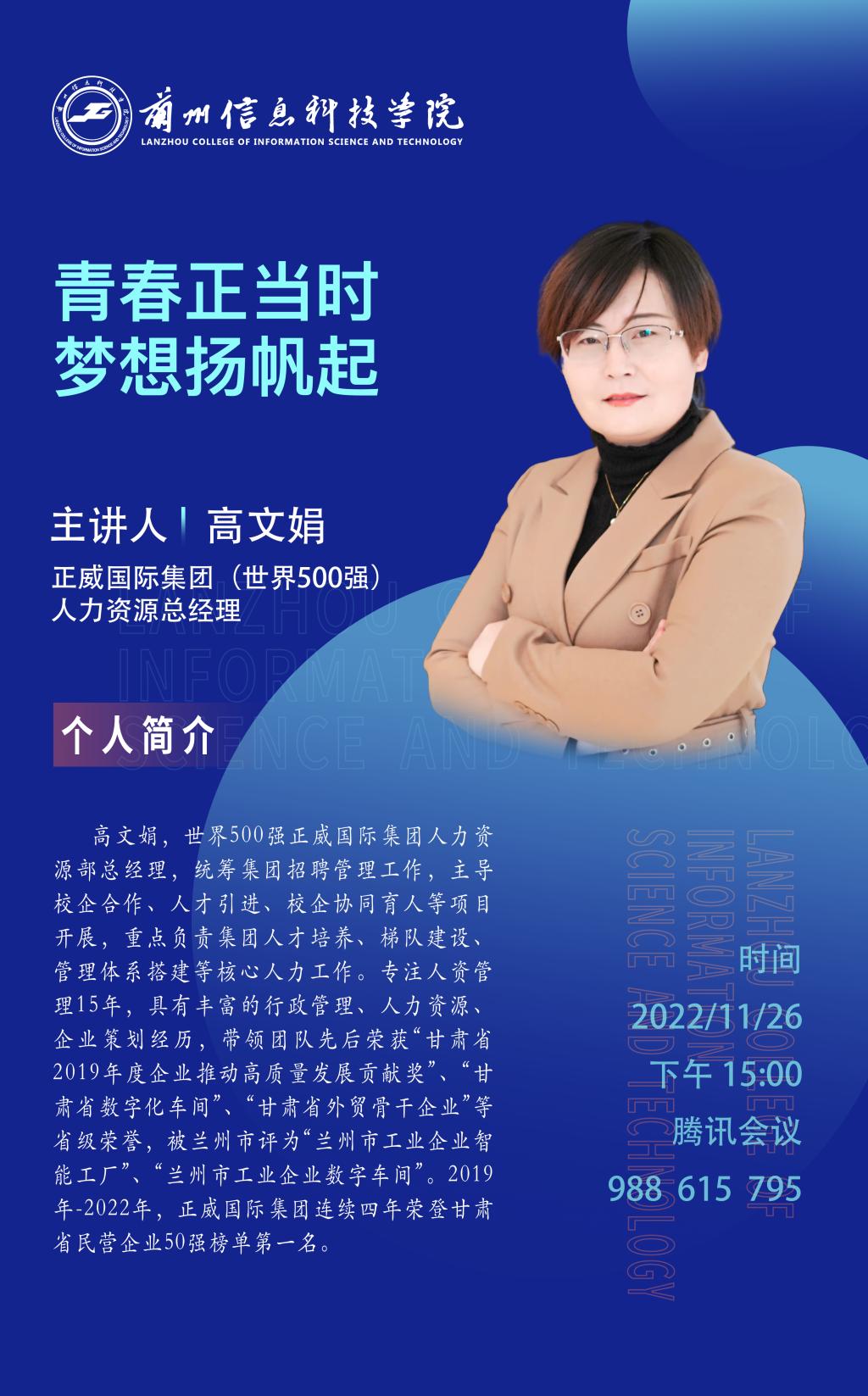 11月26日,BEAT365英国官网邀请世界500强企业正威国际集团兰州项目人力资源副总经理高文娟女士面向机电工程学院毕业生开展就业专题宣讲。