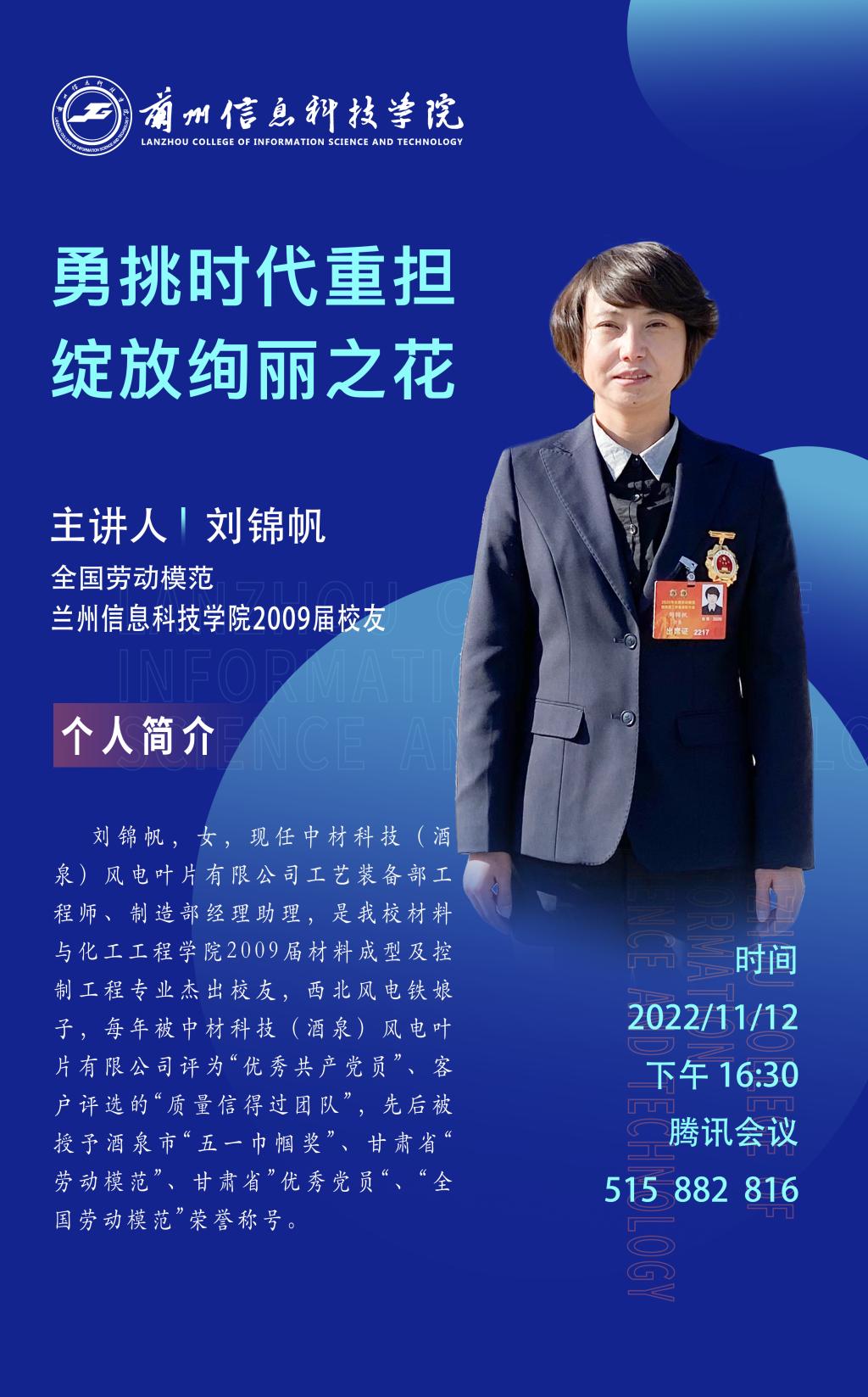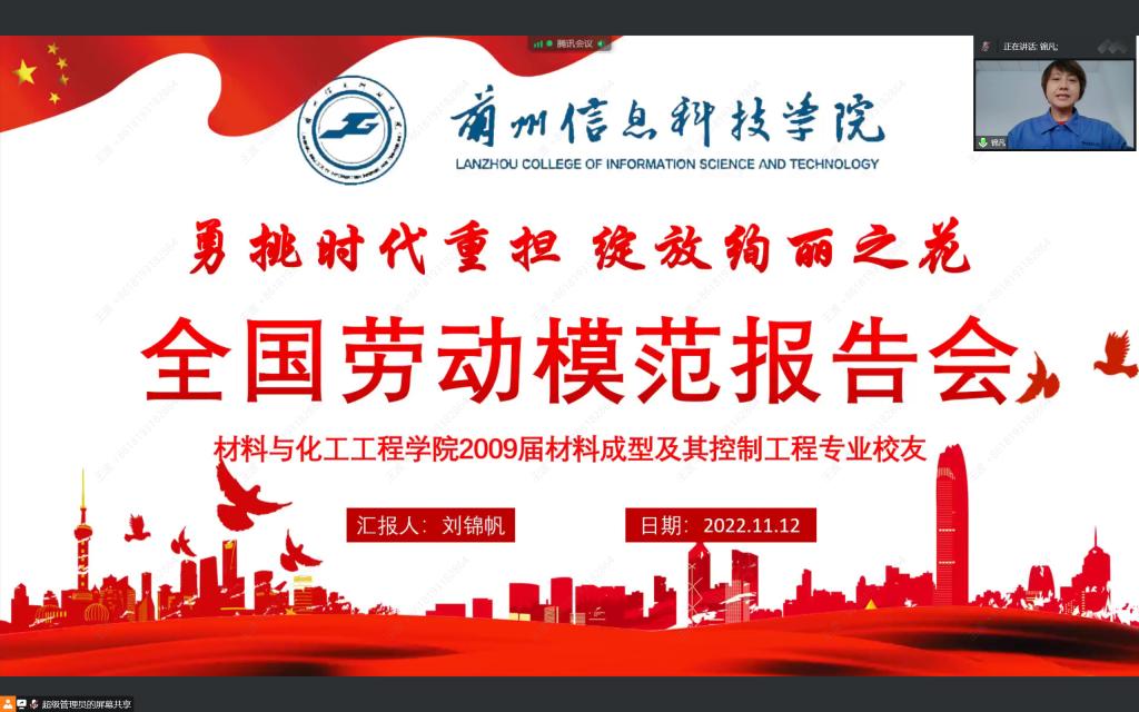 11月12日,全国劳动模范荣誉称号获得者、中材科技(酒泉)风电叶片有限公司工艺装备部工程师、2009届校友刘锦帆应邀为BEAT365英国官网师生作报告。报告主题为《勇挑时代重担 绽放绚丽之花》,学校材料与化工工程学院全体师生通过线上方式认真聆听学习。