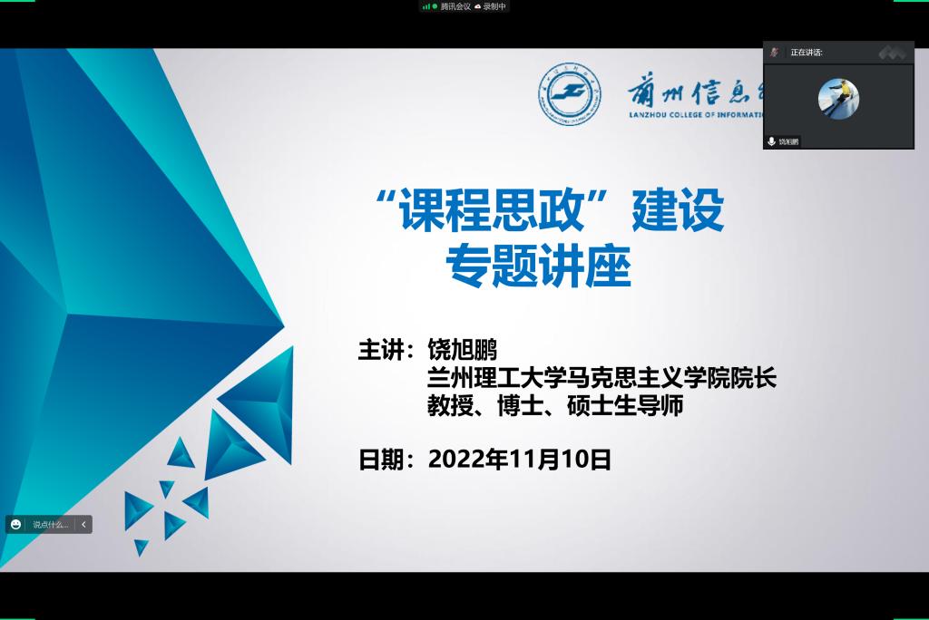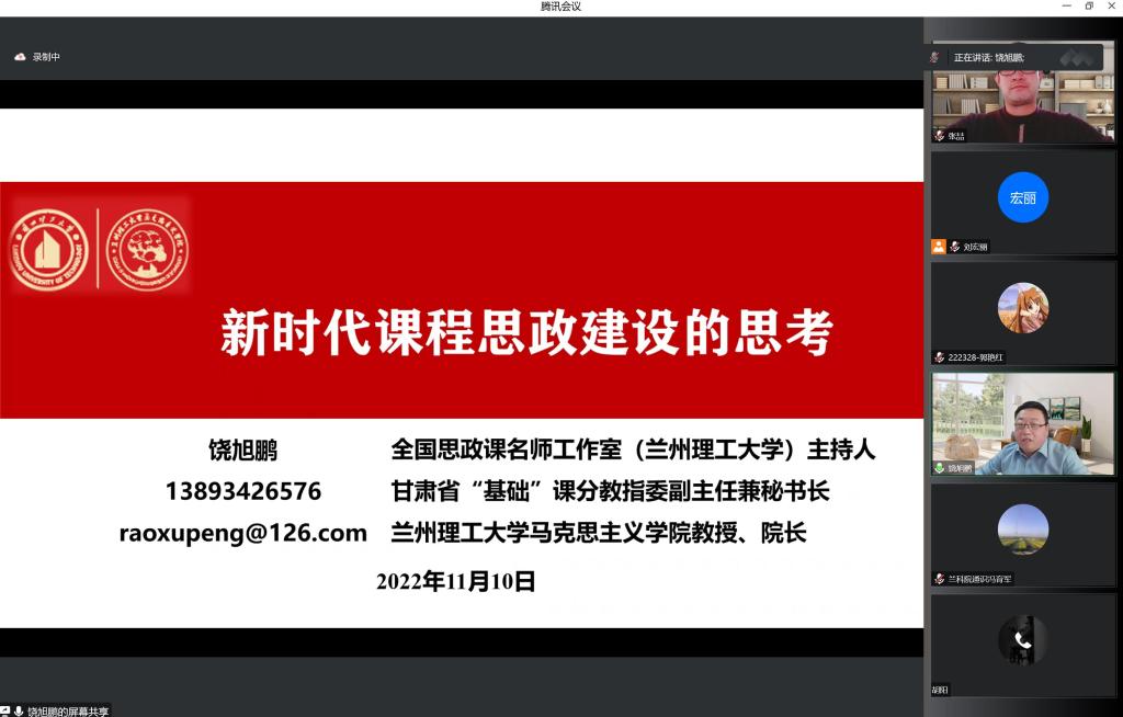 为了进一步提升我校教师开展课程思政建设能力,根据学校教学工作安排,BEAT365英国官网马克思主义学院邀请兰州理工大学马克思主义学院院长、硕士生导师饶旭鹏教授于2022年11月10日下午通过“线上平台”为全校专职教师开展了题为“新时代课程思政建设的思考”的专题学术讲座。教务处负责人、二级教学单位负责人、系室主任、全体专职教师参加了讲座。