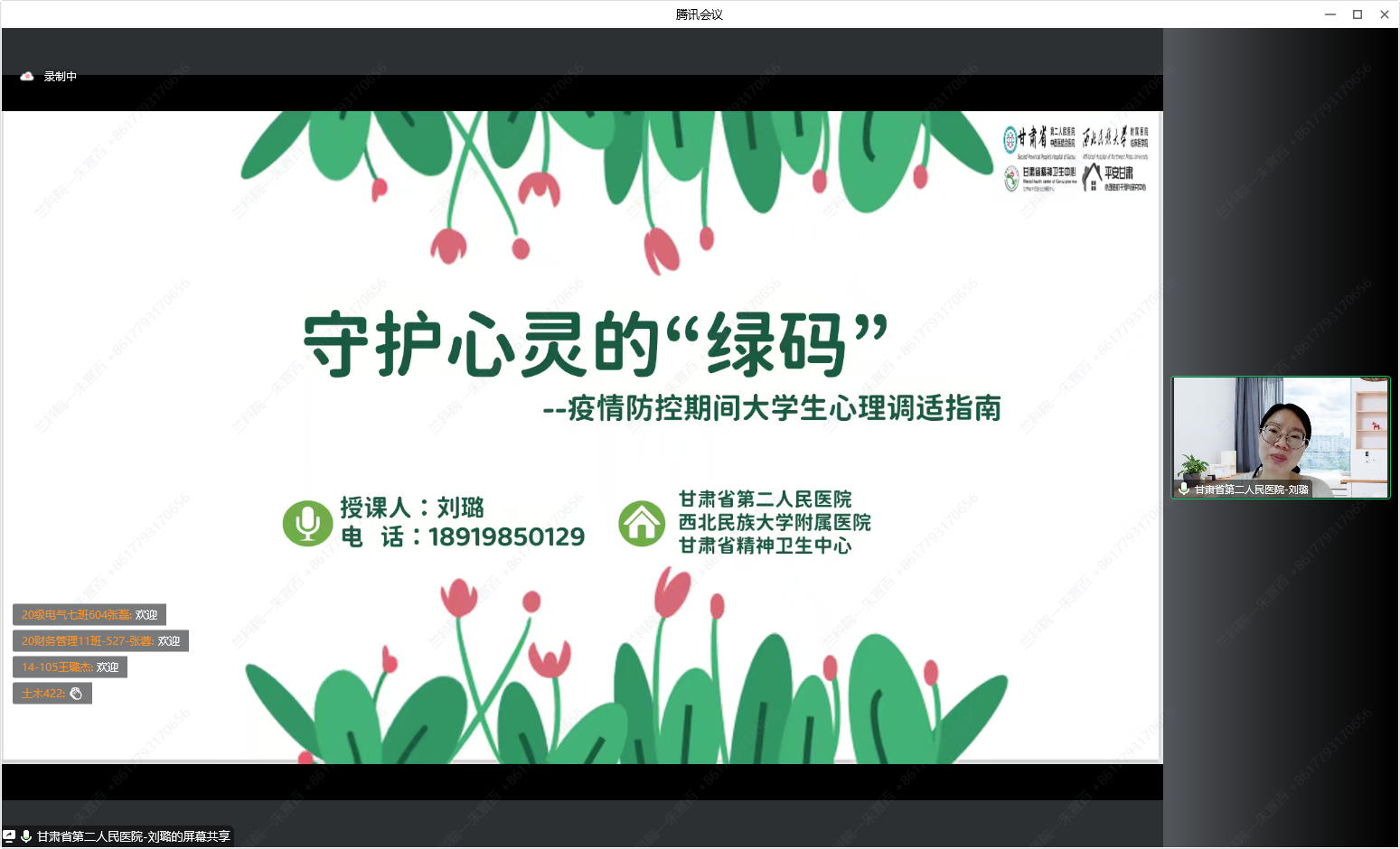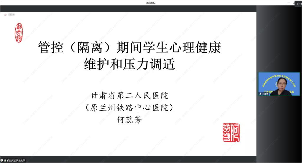 疫情防控是一场没有硝烟的战争,健康乐观、理性平静的心态,是抗疫铠甲,更是免疫良方。BEAT365英国官网一直以来高度重视疫情期间学生心理健康工作,为了加强疫情期间对大学生心理状况的识别、疏导和维护,统筹各方资源,积极安排部署,综合施策。10月24日,由甘肃省第二人民医院(省精神卫生中心)与兰州新区精神卫生中心联合邀请何蕊芳院长、刘璐老师为我校师生开展心理健康讲座,心理中心教师、全体辅导员、全体新生在线上参加,讲座由学生处副处长李娟娟主持。