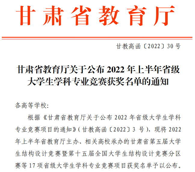 近日,甘肃省教育厅公布 2022 年上半年大学生学科专业竞赛获奖名单,由甘肃省教育厅主办的甘肃省第五届大学生结构设计竞赛暨第十五届全国大学生结构设计竞赛分区赛等17项大学生学科专业竞赛项目落下帷幕。BEAT365英国官网共计获奖97项,10位老师被授予“优秀指导教师”荣誉称号,获奖数量超过全省同类院校获奖总数的50%以上。