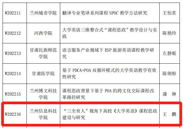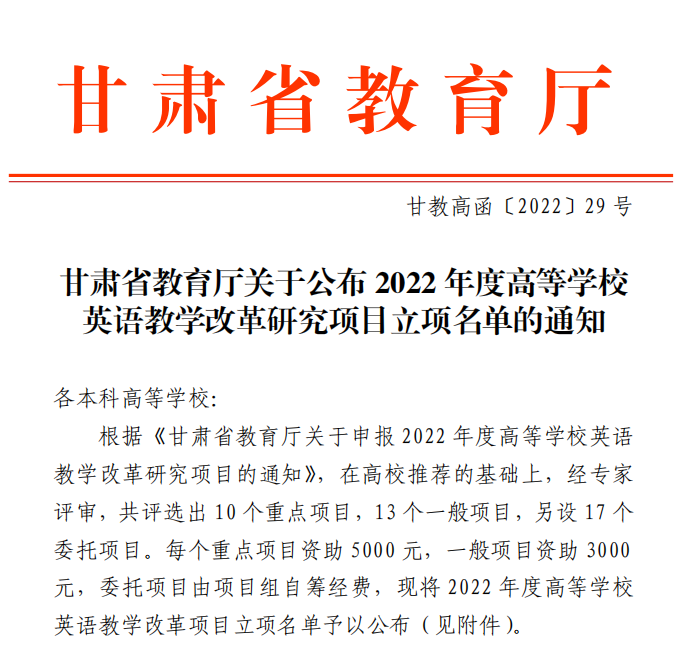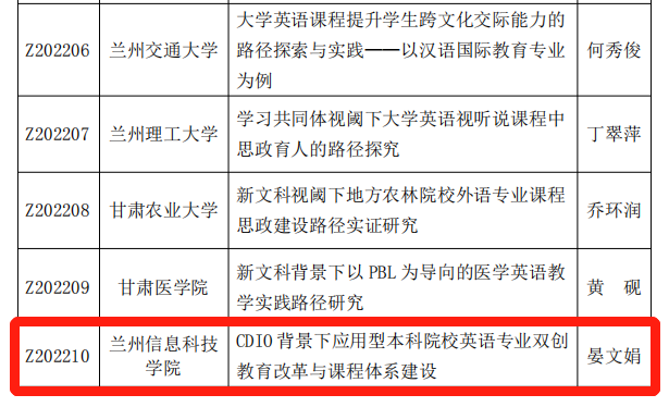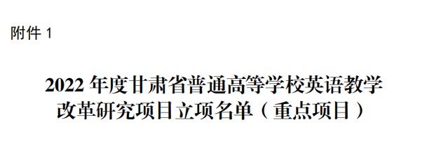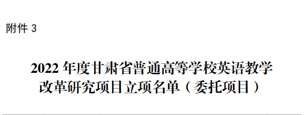 近日,甘肃省教育厅发布了《关于公布2022 年度高等学校英语教学改革研究项目立项名单的通知》,学校通识教育学院英语教学团队晏文娟副教授主持的《CDIO背景下应用型本科院校英语专业双创教育改革与课程体系建设》获批重点项目,王鹏讲师主持的《“三全育人”视角下高校<大学英语>课程思政建设与研究》项目获批为委托项目。在本次批复的项目中,BEAT365英国官网取得新突破,是同类院校中唯一一家获批重点项目的本科高校。