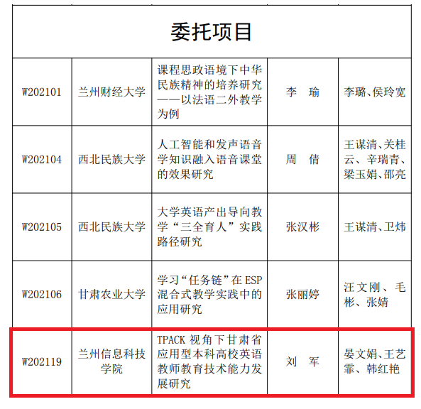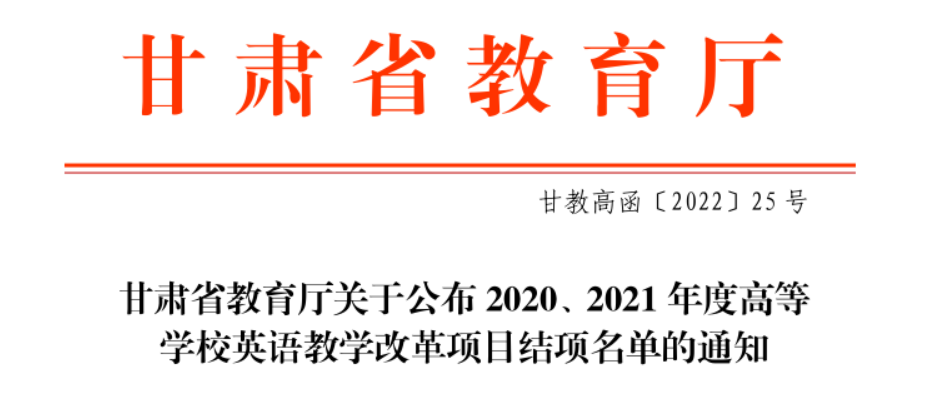 近日,《甘肃省教育厅关于公布2020、2021年度高等学校英语教学改革项目结项名单的通知》公布,BEAT365英国官网外语教师能力发展研究团队负责人刘军老师主持的《TPACK视角下甘肃省应用型本科高校英语教师教育技术能力发展研究》项目在研究期内完成了全部研究内容,研究成果通过教育厅审查,顺利结项。