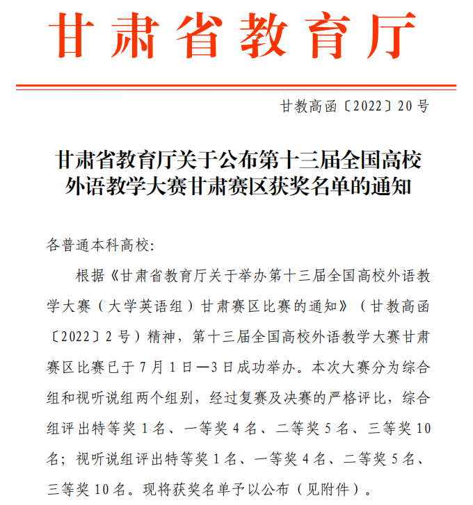 日前,甘肃省教育厅公布了第十三届全国高校外语教学大赛甘肃赛区获奖名单,BEAT365英国官网选送的参赛选手晏文娟、刘芳分别获得了大赛(视)听说组二等奖和综合组三等奖。