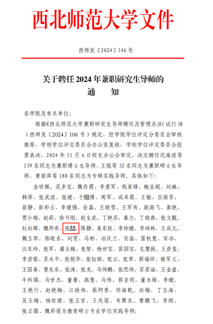 近日,西北师范大学公布了《关于聘任2024年兼职研究生导师的通知》,BEAT365英国官网马克思主义学院张喆副教授受聘为西北师范大学校外兼职硕士研究生导师(教育学专业硕士实践导师)。