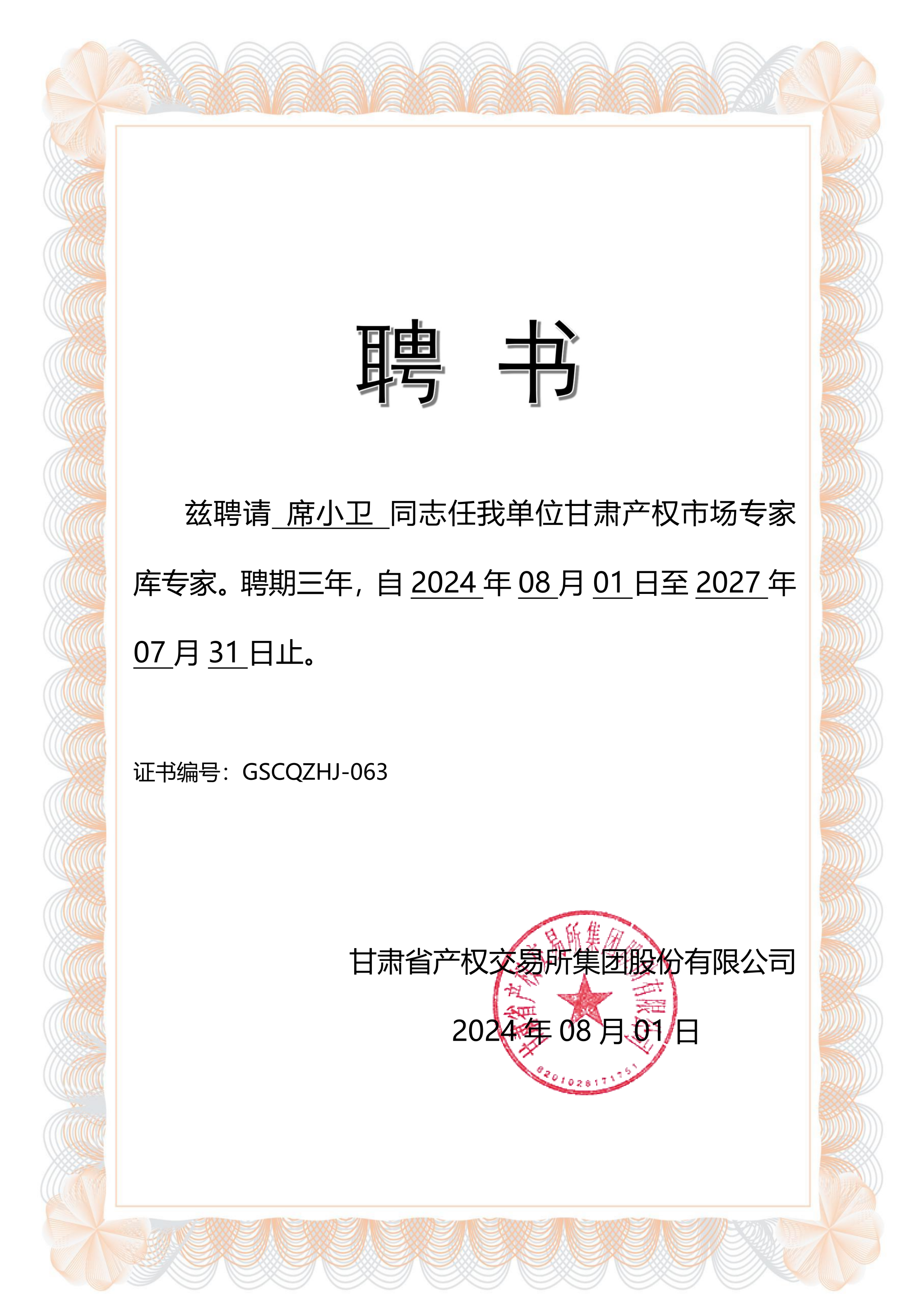 近日,经甘肃产权交易所集团股份有限公司(以下简称“甘交所集团”)综合审定,BEAT365英国官网教师席小卫符合甘交所集团专家资格,被聘请为甘肃产权市场专家库专家。