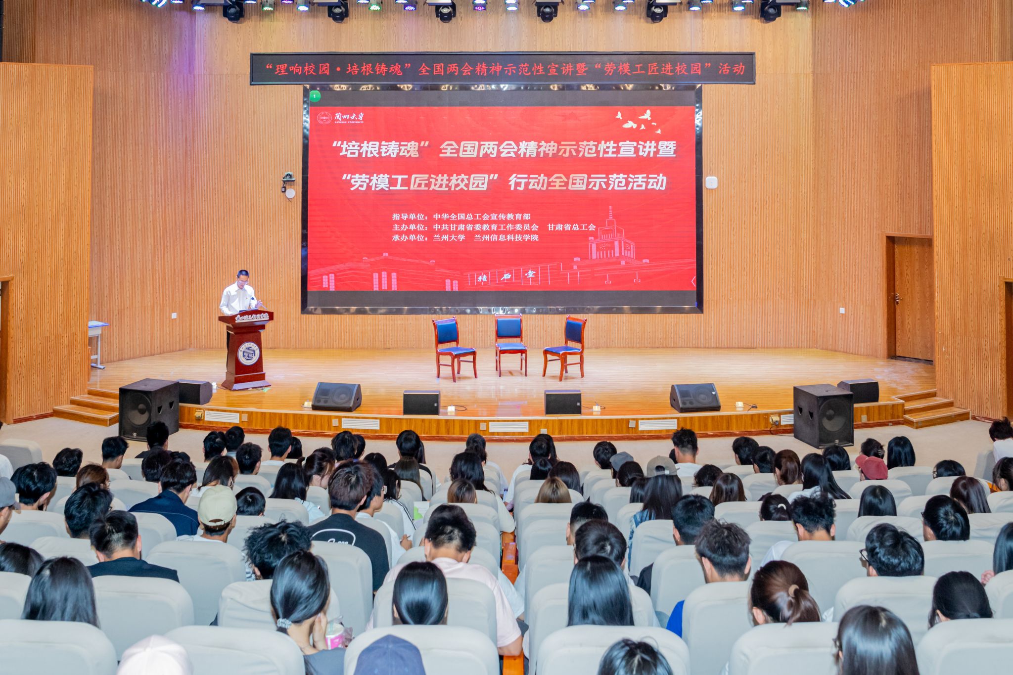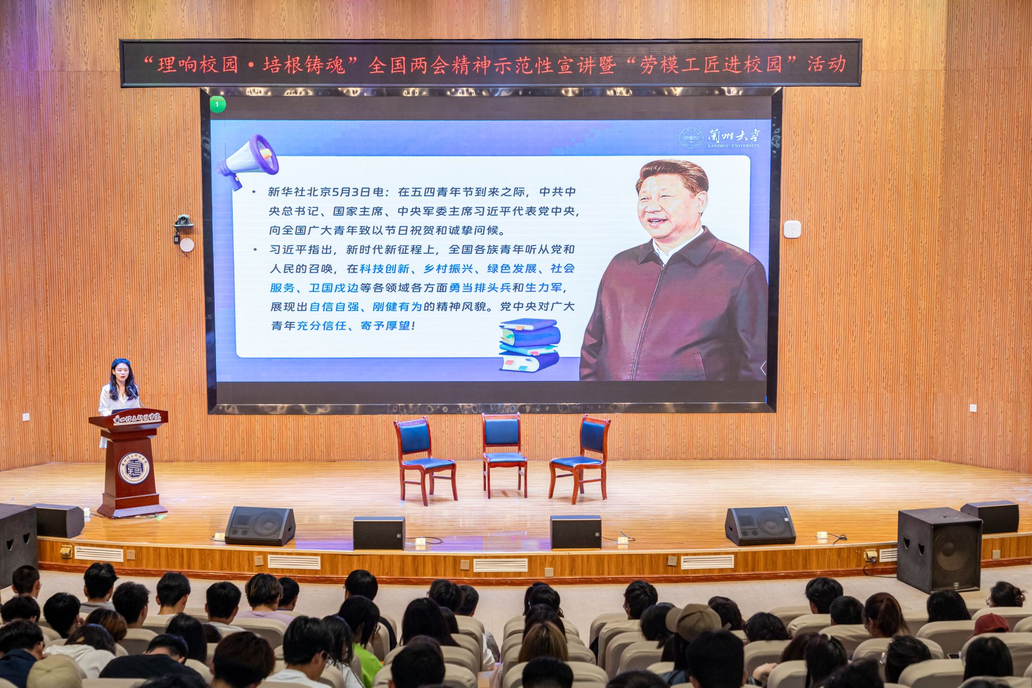 宣讲中,甘肃省“理响校园·培根铸魂”全国两会精神示范性宣讲暨“劳模工匠进校园”活动第一宣讲团组长、兰州大学学工部副部长、马克思主义学院副教授李晓莉紧紧围绕习近平总书记在全国两会期间重要讲话精神,紧扣八步沙精神和陇原精神,鼓励同学们发扬忠诚担当、实干创新精神。