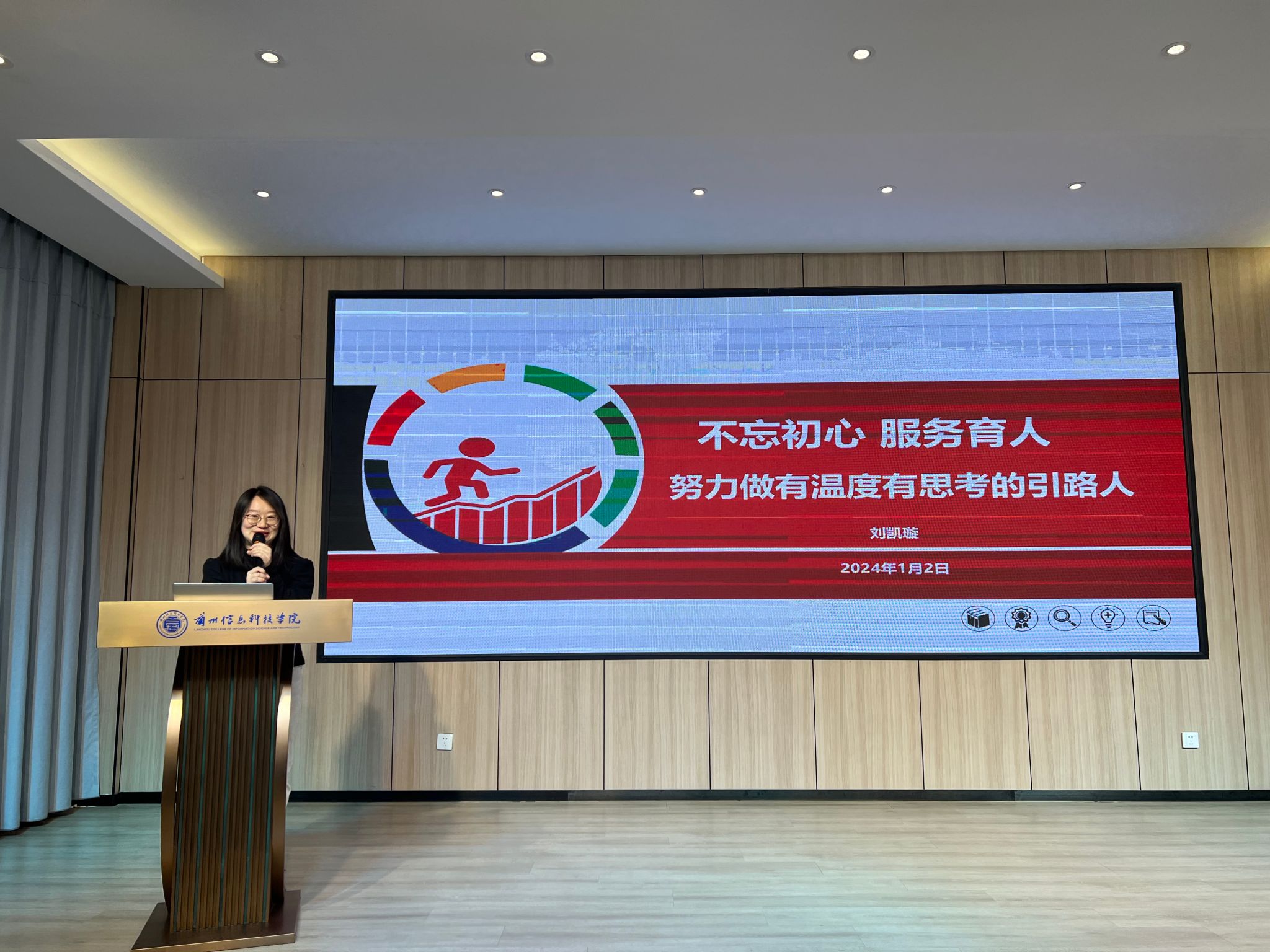 刘凯璇老师受聘为学校辅导员队伍建设客座教授,并做题为《不忘初心、服务育人,努力做有温度会思考的引路人》的主题培训。她结合自己7年辅导员工作经验和参加省级辅导员素质能力大赛经验,分享了如何牢牢把握学生群体特点,学生思想政治教育“3+2”模式,日常管理“3+3理论”,“1-2-3团学工作新格局”等既有理论高度又切合实际的学生工作理念和经验。在培训最后,辅导员老师就工作中的思考、遇到的实际问题和培训感受与刘老师现场交流探讨。