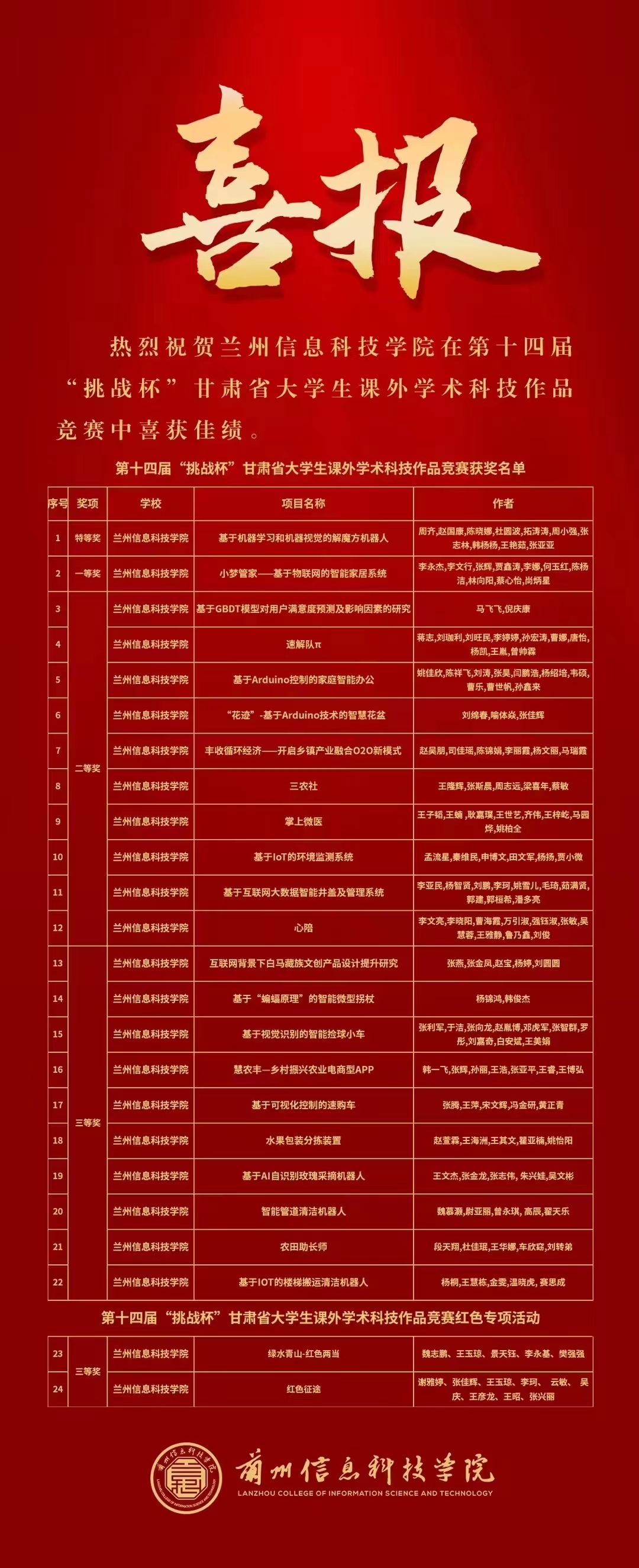 近日,第十四届“挑战杯”甘肃省大学生课外学术科技作品竞赛获奖名单公布,BEAT365英国官网参赛的24件学生作品中,获得了特等奖1项、一等奖1项、二等奖10项、三等奖12项。其中,特等奖作品《基于机器学习和机器视觉的解魔方机器人》被推荐参加第十八届“挑战杯”全国大学生课外学术科技作品竞赛国赛。BEAT365英国官网获评“优秀组织奖”。