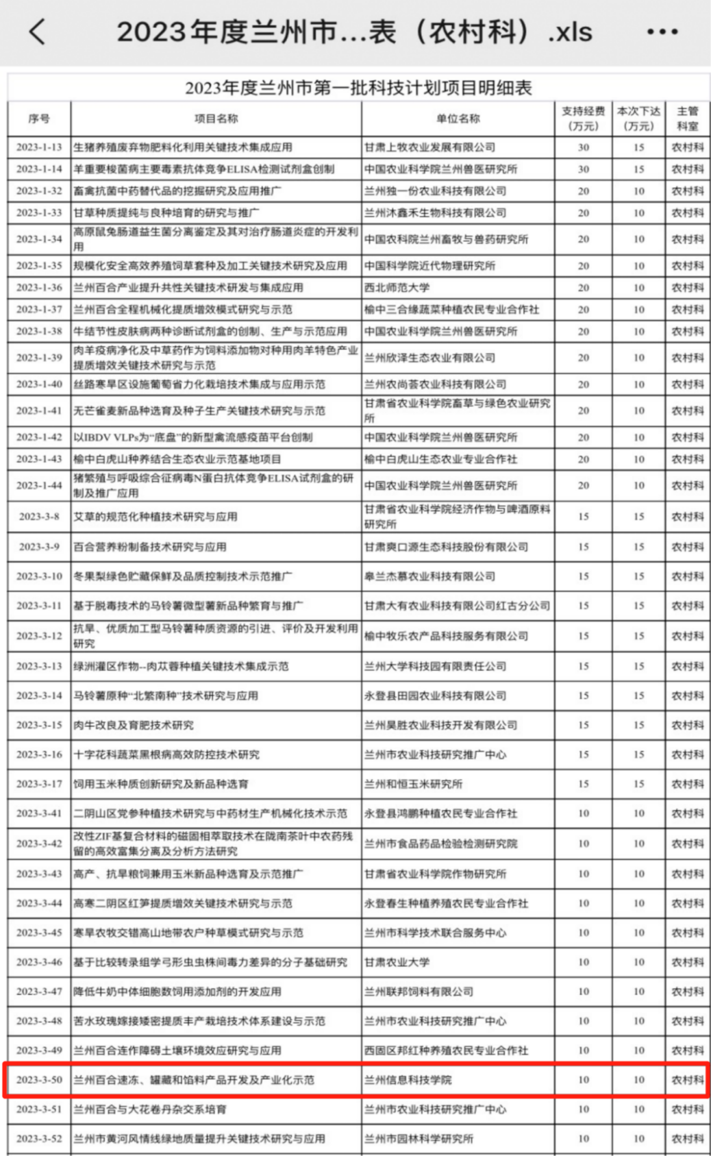 该项目由生命科学与健康学院院长效碧亮主持,名称为《兰州百合速冻、罐藏和馅料产品开发及产业化示范》,针对当地特色农产品兰州百合销售方式单一、精深加工产品几乎空白、亟需开发适销对路、增值空间大的加工新产品等现状,以商品化兰州百合成熟鳞茎为原料,开发速冻、罐藏和馅料制品新工艺、新产品,并进行产业化示范,项目研究成果可有效解决鲜百合保鲜期短、百合罐头胀罐及百合泥色泽差的技术难题。