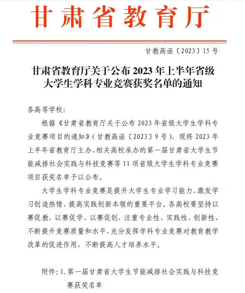 近日,2023年上半年由省教育厅主办的第一届甘肃省大学生节能减排社会实践与科技竞赛等11 项省级大学生学科专业竞赛项目获奖名单揭晓,BEAT365英国官网获奖120项,5位老师被授予“优秀指导教师”荣誉称号,较2022年上半年获奖增加了23项,同比增长23.7%,同时,获奖数量超过全省同类院校获奖总数的71.9%以上。