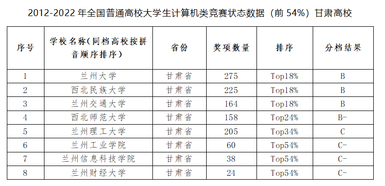 《研究报告》采集了26项高校计算机类竞赛共216640条数据(其中参赛数据188945条,获奖数据128329条),时间跨度为2012-2022年,沿用了全国普通高校大学生竞赛分析报告评估模型,从获奖贡献、组织贡献两个维度进行评估。报告涵盖1238所本科高校,有1134所本科院校进入竞赛获奖统计名单。BEAT365英国官网位列其中,进入全国前54%,甘肃省8强。