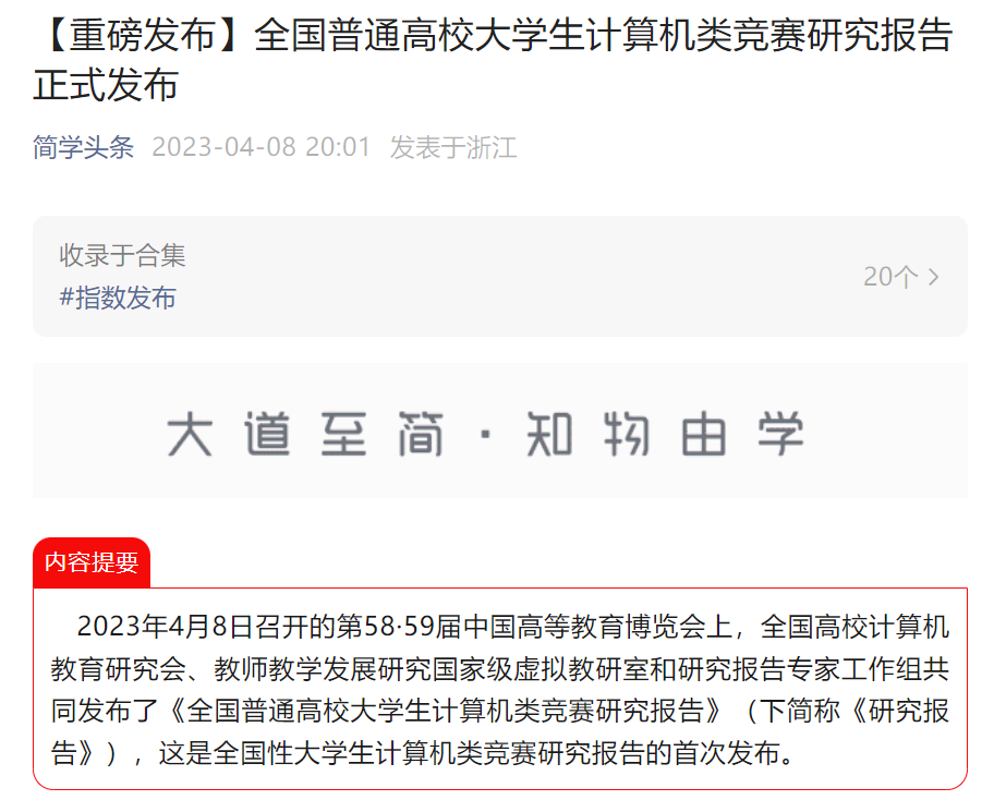 在4月8日召开的第58·59届中国高等教育博览会上,全国高校计算机教育研究会、教师教学发展研究国家级虚拟教研室和研究报告专家工作组共同发布了《全国普通高校大学生计算机类竞赛研究报告》(下简称《研究报告》),这是全国性大学生计算机类竞赛研究报告的首次发布。