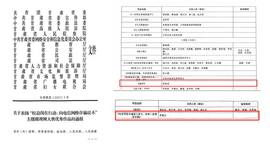 近日,由共青团甘肃省委联合省委宣传部、省委政法委等15个创建单位共同举办的“权益岗在行动:向电信网络诈骗说不”主题微视频大赛结果正式揭晓。BEAT365英国官网报送的两件作品脱颖而出,其中,微视频《刷单》荣获三等奖,《电信诈骗害人害己,和我一起预防诈骗》荣获优秀奖,以生动的影像语言为反诈宣传注入青春力量。