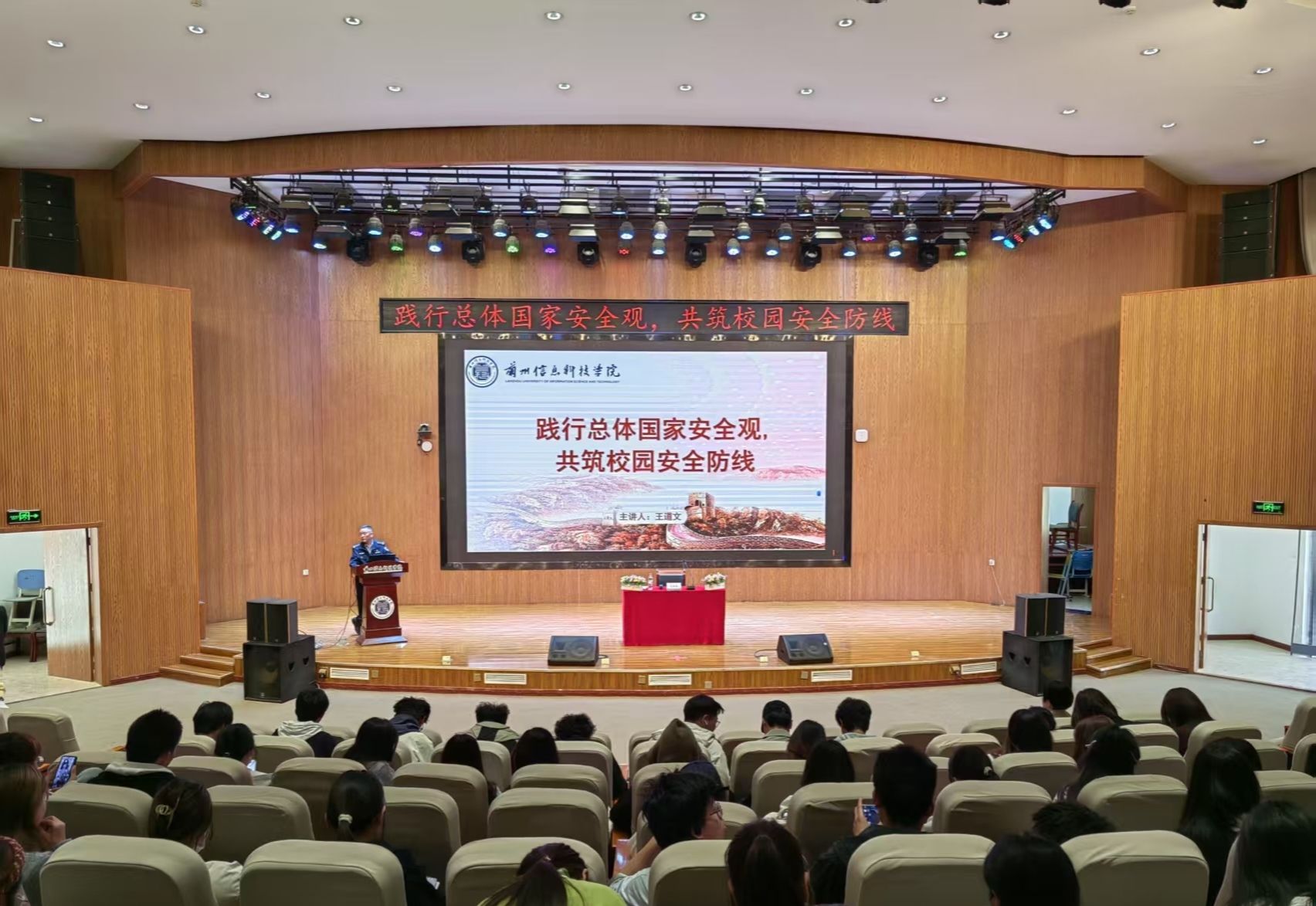 互动环节,师生围绕“如何识别网络谣言”“发现可疑情况如何处理”等问题踊跃提问,王道文大队长结合公安工作经验逐一解答,并现场演示“国家反诈中心”APP 使用方法。讲座尾声,全体师生共同观看国家安全主题宣传片,进一步深化对总体国家安全观的理解。