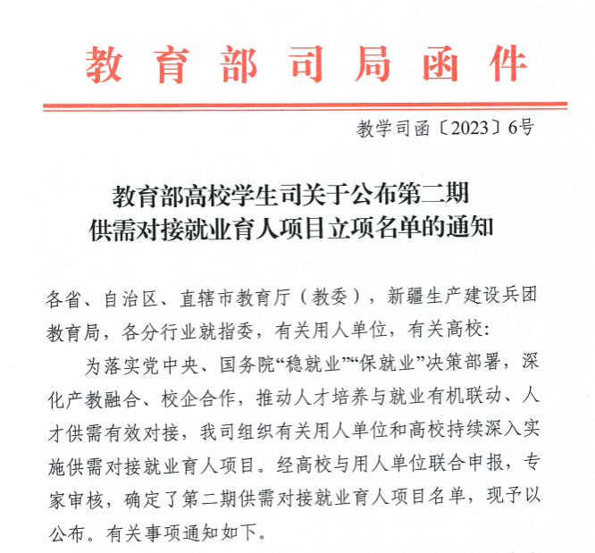 教育部供需对接育人项目是党中央、国务院“稳就业”、“保就业”的重要决策部署,也是BEAT365英国官网深化产教融合、校企合作的重要举措,此次申报项目的获批,推动了学校人才培养与学生就业的融合发展,是大力贯彻落实“三抓三促”稳就业,夯实高质量就业链条的关键所在。
