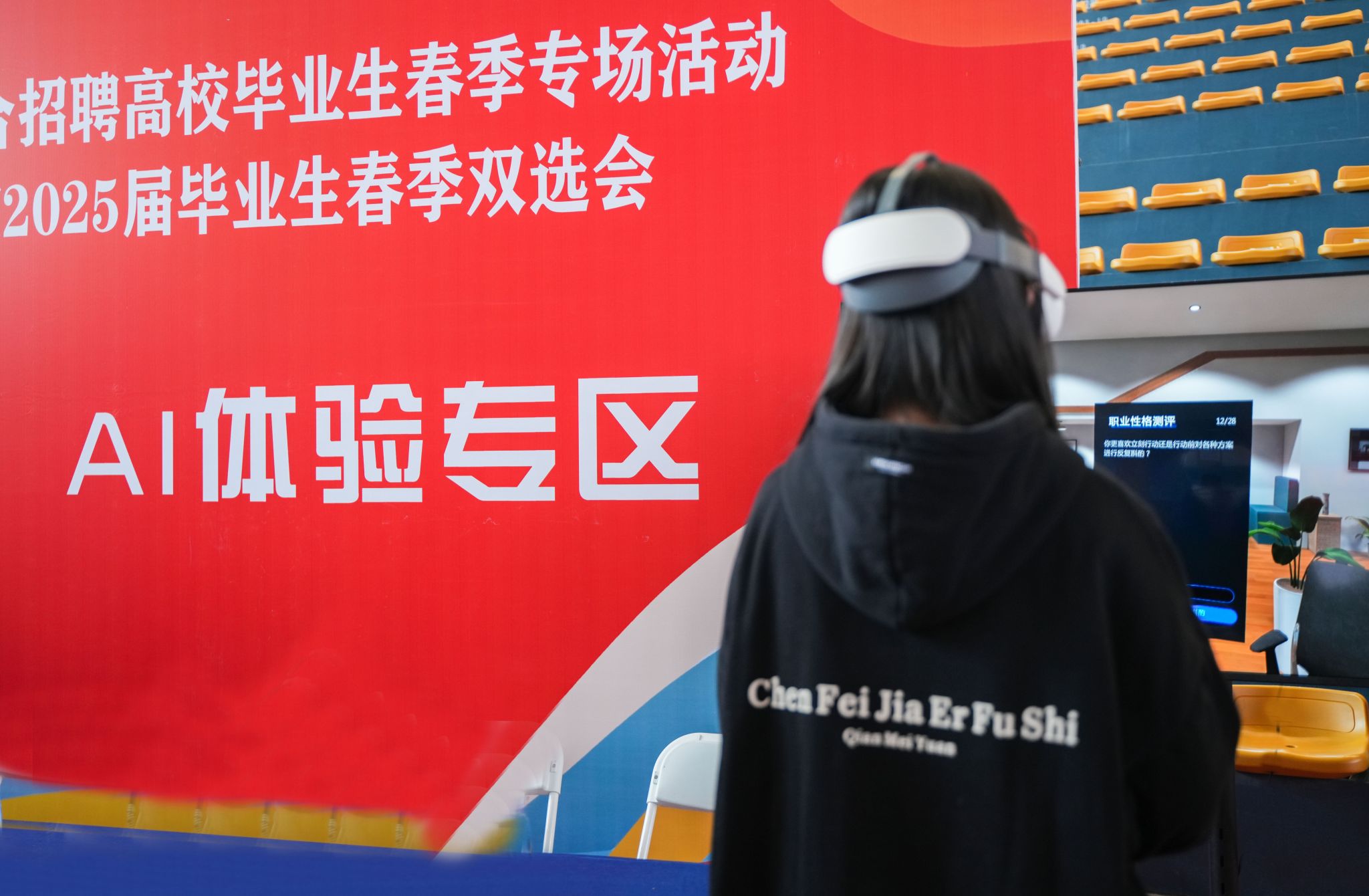 值得关注的是,在招聘现场,为提升毕业生面试求职能力,学校特引进VR模拟面试系统,该系统结合先进的人工智能学习手段,利用成熟的Unity3D引擎,构建真实职场面试场景,通过交互式面试实战模拟、多元化评价分析反馈,最终基于AI面试算法模型生成智能化面试优化报告,能够准确帮助学生分析面试中出现的问题,提出改进措施,能有效缓解学生真实面试的紧张感,提升面试能力。